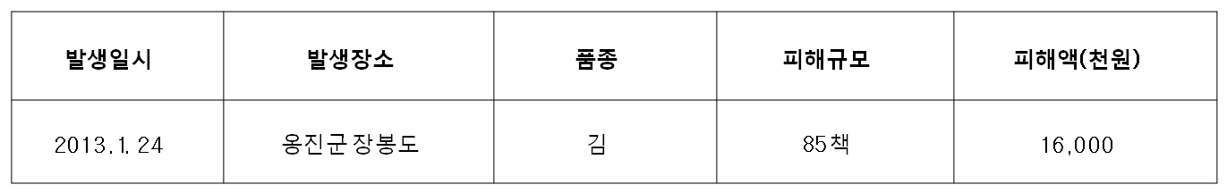 o 지난 주 (1월 22∼28일) 한파에 의한 양식생물의 피해는 유빙에 의한 지주식 김양식 시설 파괴로 피해현황은 아래와 같음.