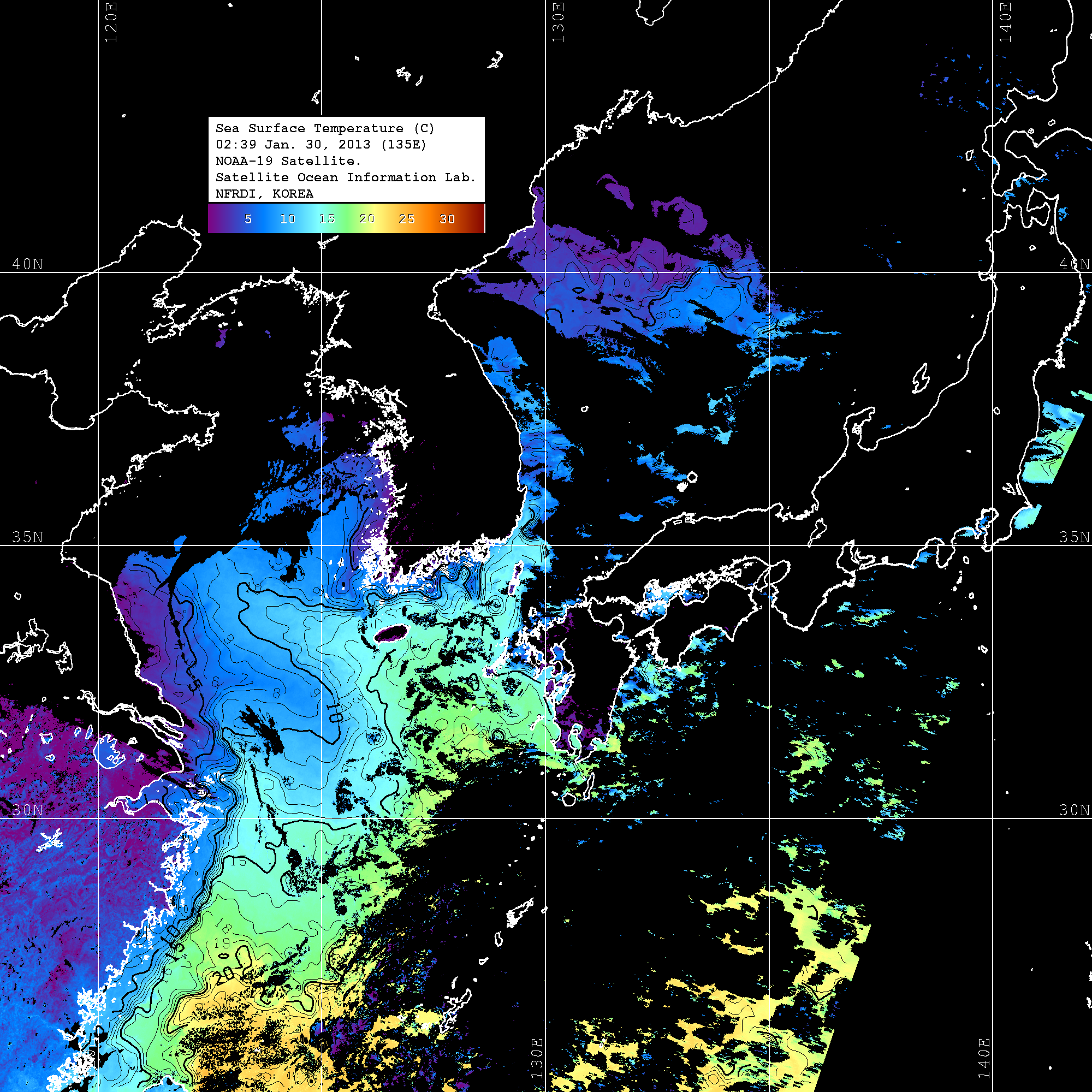 o 2013년 01월 30일 NOAA 위성영상입니다. o 영상 시간 및 수온분포는 범례를 참고하시기 바랍니다. o 검은색은 구름을 나타냅니다. o 그림을 클릭하시면 크게 보실 수 있습니다.