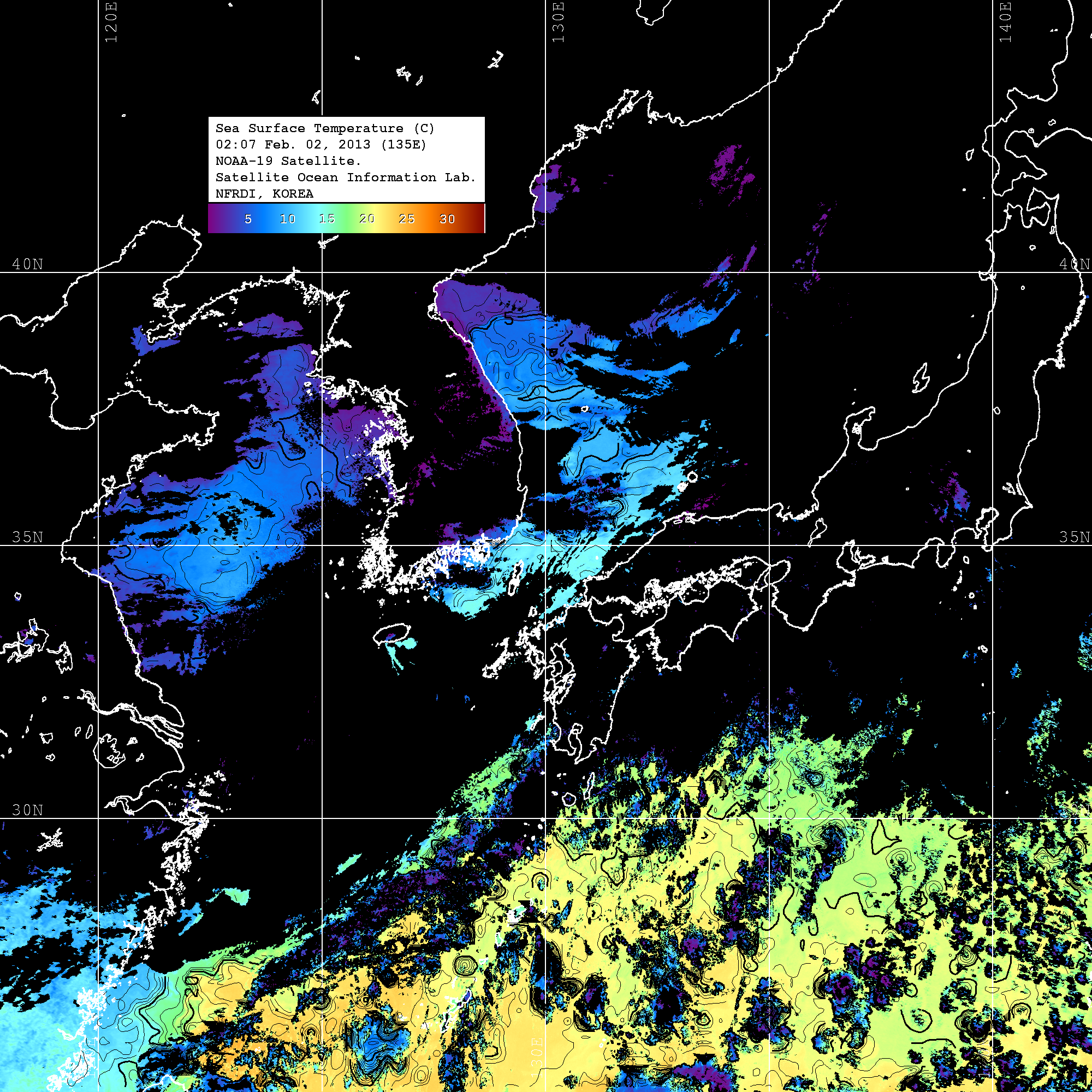 o 2013년 02월 02일 NOAA 위성영상입니다. o 영상 시간 및 수온분포는 범례를 참고하시기 바랍니다. o 검은색은 구름을 나타냅니다. o 그림을 클릭하시면 크게 보실 수 있습니다.