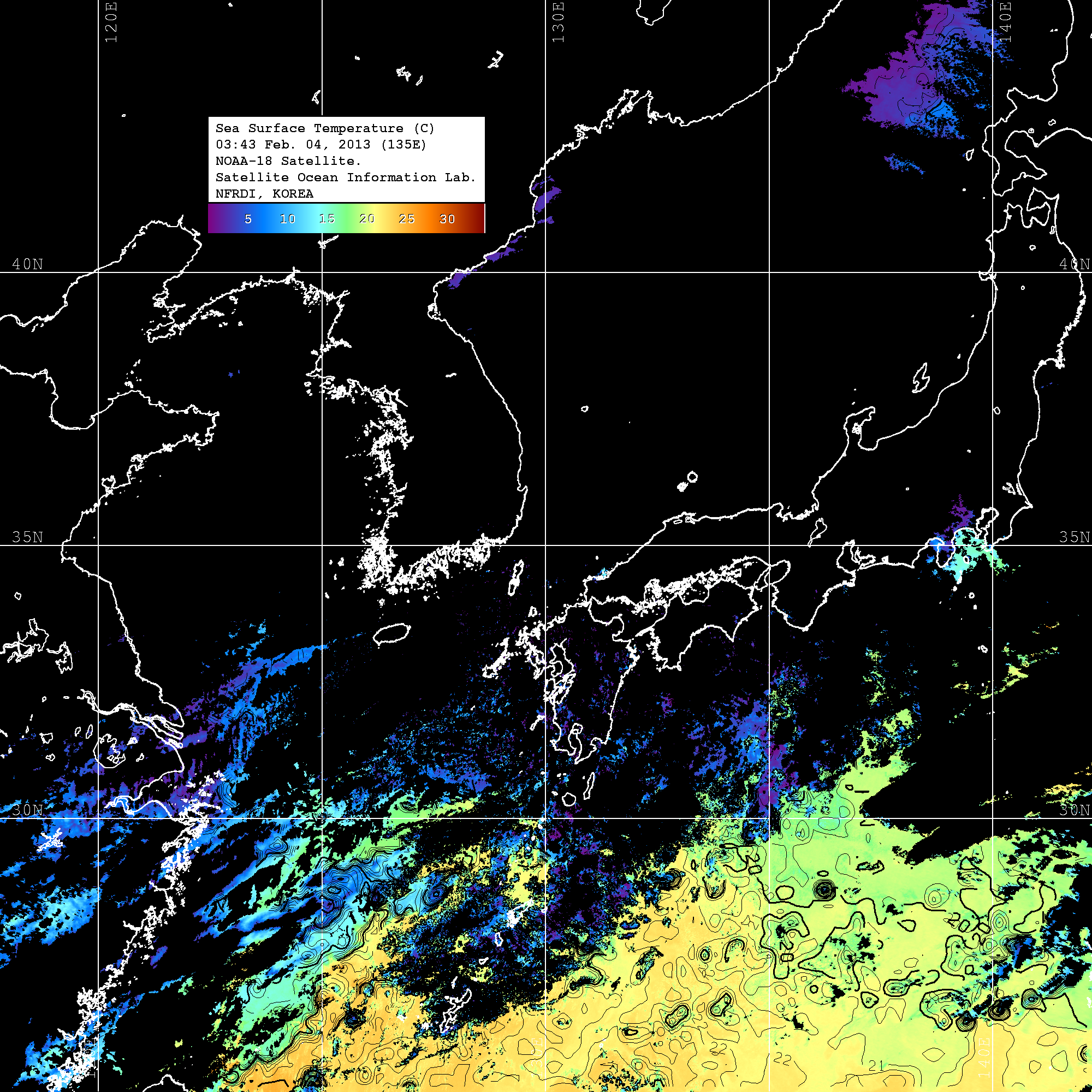 o 2013년 02월 04일 NOAA 위성영상입니다. o 영상 시간 및 수온분포는 범례를 참고하시기 바랍니다. o 검은색은 구름을 나타냅니다. o 그림을 클릭하시면 크게 보실 수 있습니다.
