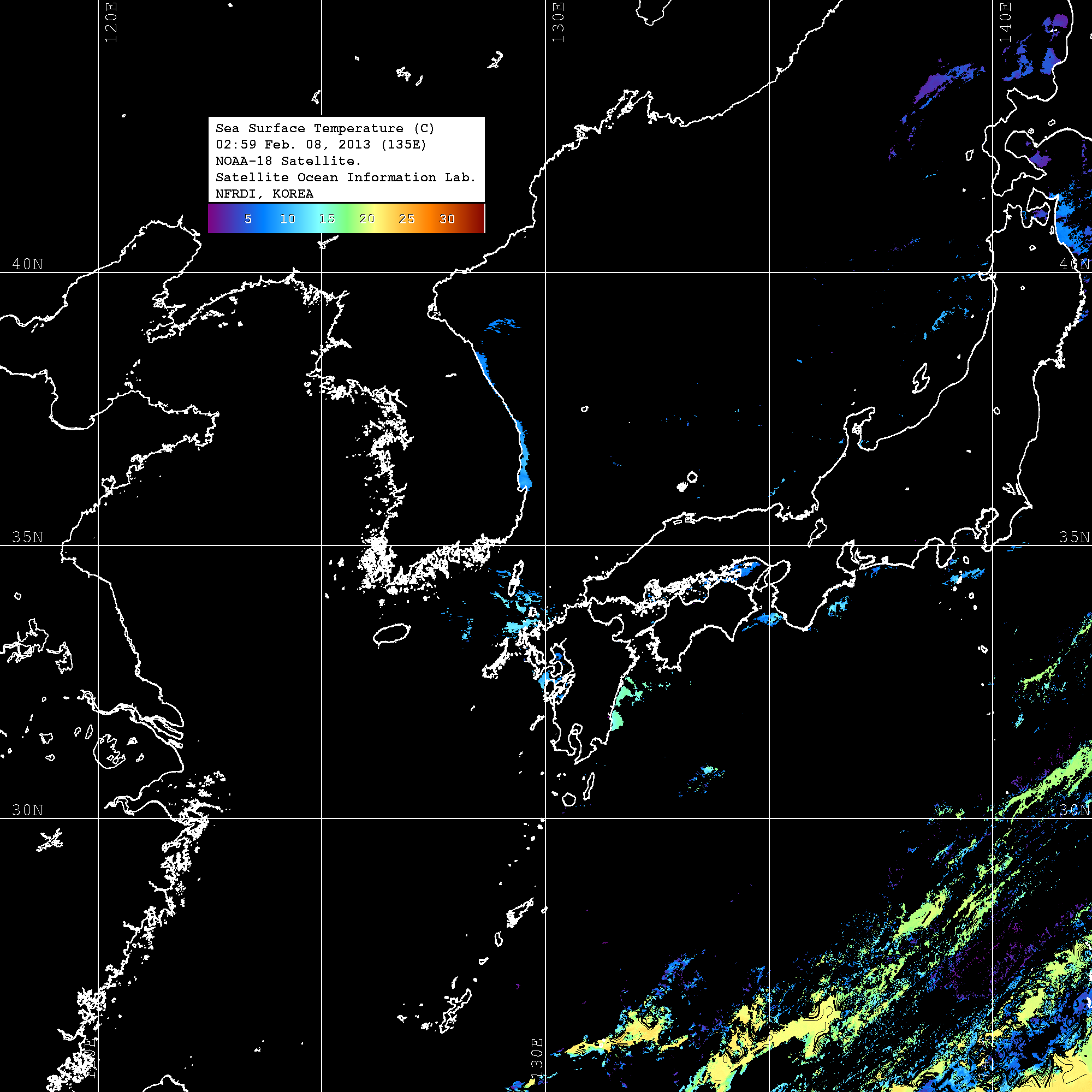 o 2013년 02월 08일 NOAA 위성영상입니다. o 영상 시간 및 수온분포는 범례를 참고하시기 바랍니다. o 검은색은 구름을 나타냅니다. o 그림을 클릭하시면 크게 보실 수 있습니다.