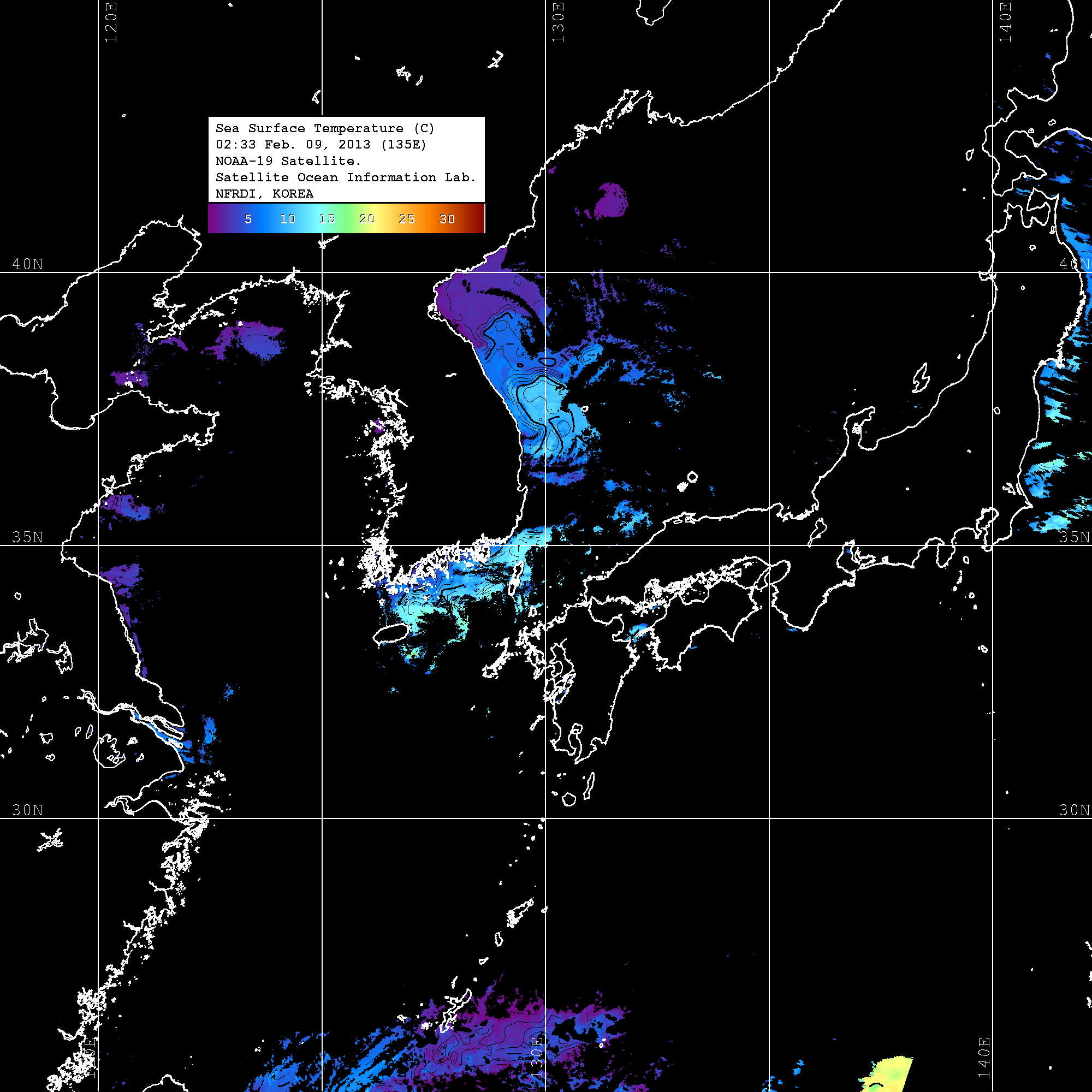 o 2013년 02월 09일 NOAA 위성영상입니다. o 영상 시간 및 수온분포는 범례를 참고하시기 바랍니다. o 검은색은 구름을 나타냅니다. o 그림을 클릭하시면 크게 보실 수 있습니다.