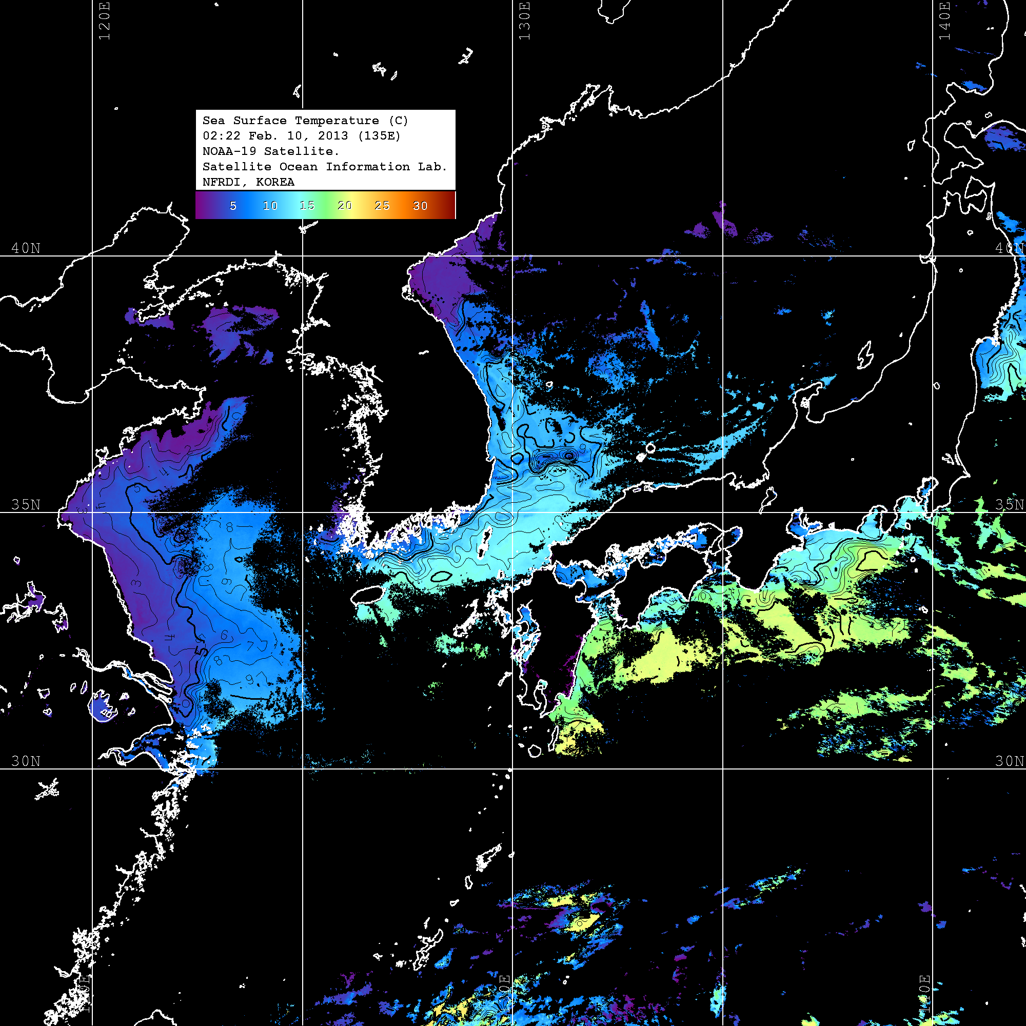 o 2013년 02월 10일 NOAA 위성영상입니다. o 영상 시간 및 수온분포는 범례를 참고하시기 바랍니다. o 검은색은 구름을 나타냅니다. o 그림을 클릭하시면 크게 보실 수 있습니다.