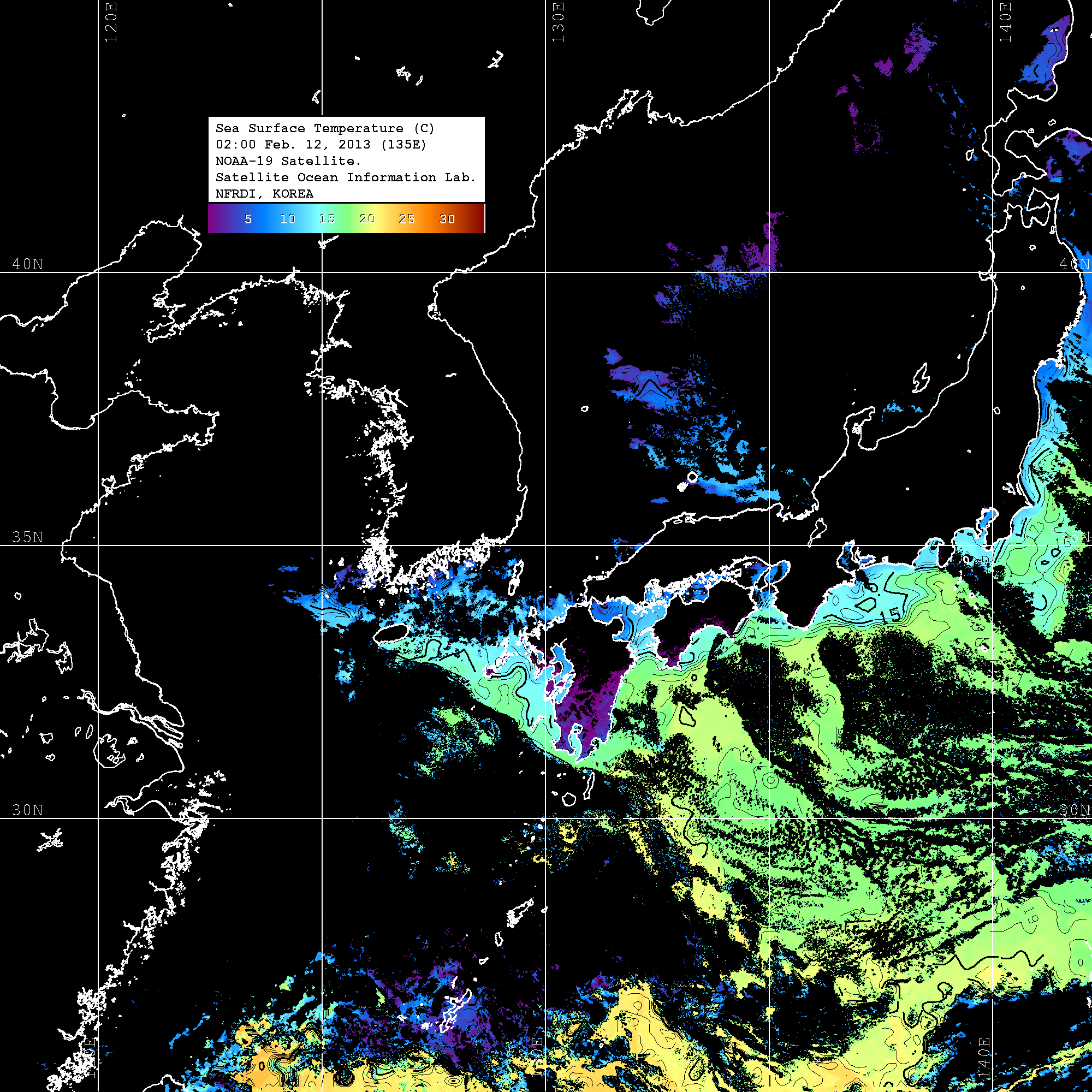 o 2013년 02월 12일 NOAA 위성영상입니다. o 영상 시간 및 수온분포는 범례를 참고하시기 바랍니다. o 검은색은 구름을 나타냅니다. o 그림을 클릭하시면 크게 보실 수 있습니다.