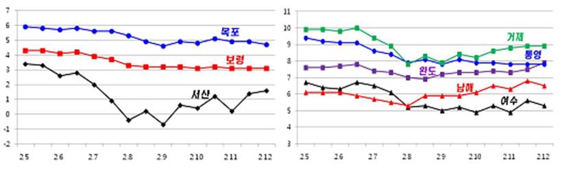 o 국립수산과학원의 실시간 관측을 통한 2월 5∼12일, 서해 3개소 (서산 가로림만, 보령 천수만 입구, 목포 죽교)와 남해 5개소 (완도 노화, 여수 신월, 남해 강진, 통영 사량, 거제 가배)의 자료 분석 결과, 수온 변동 경향은 아래와 같음. o 수온은 서해 연안에서 -1∼6℃, 남해 연안 4∼10℃의 분포 범위를 보임. 2월7∼9일의 한파로 낮아졌던 수온이 점차 회복되는 추세를 보임.