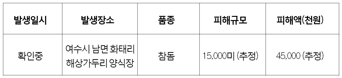 o 지난 주 (2월 5∼11일) 한파에 의한 양식생물의 피해는 아래와 같음.