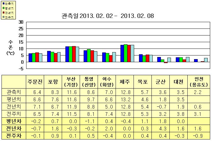 o 금주(2013.02.02~2013.02.08)의 한반도 연안 표면수온은 동해 연안역에서 섭씨 6~12도, 남해 연안역 7~13도, 서해 연안역에서 2~6도로 나타납니다. o 평년에 비해 포항 0.7도 높음을 제외한 동해 연안역은 비슷하게, 여수(화양) 0.4도 높음을 제외한 남해 연안역은 0.5∼1.5도 낮게, 대천 비슷함을 제외한 서해 연안역은 1∼2도 높게 나타납니다. o 전년에 비해 동해 연안역은 주문진 0.7도 낮고, 포항 1.6도 높고, 부산(기장) 비슷하게 나타나며, 여수(화양) 2도 높음을 제외한 남해 연안역은 비슷하게, 목포 비슷함을 제외한 서해 연안역은 1.5∼4.5도 높게 나타납니다.