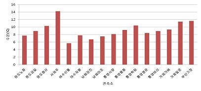 o 2월 15일 09:00 현재, 남해 양식장 주변 수온입니다. - 완도 노화 7.7℃, 완도 금일 8.9℃, 완도 청산 10.3℃, 서제주 14.2℃, 여수 신월 5.7℃, 여수 자봉 7.8℃, 남해 강진 6.7℃, 남해 미조 7.5℃, 통영 사량 8.1℃, 통영 풍화 9.2℃, 통영 학림 10.4℃, 통영 영운 8.4℃, 통영 비산 8.9℃, 거제 가배 9.3℃, 거제 일운 11.4℃, 부산 기장 11.6℃로 관측됨.