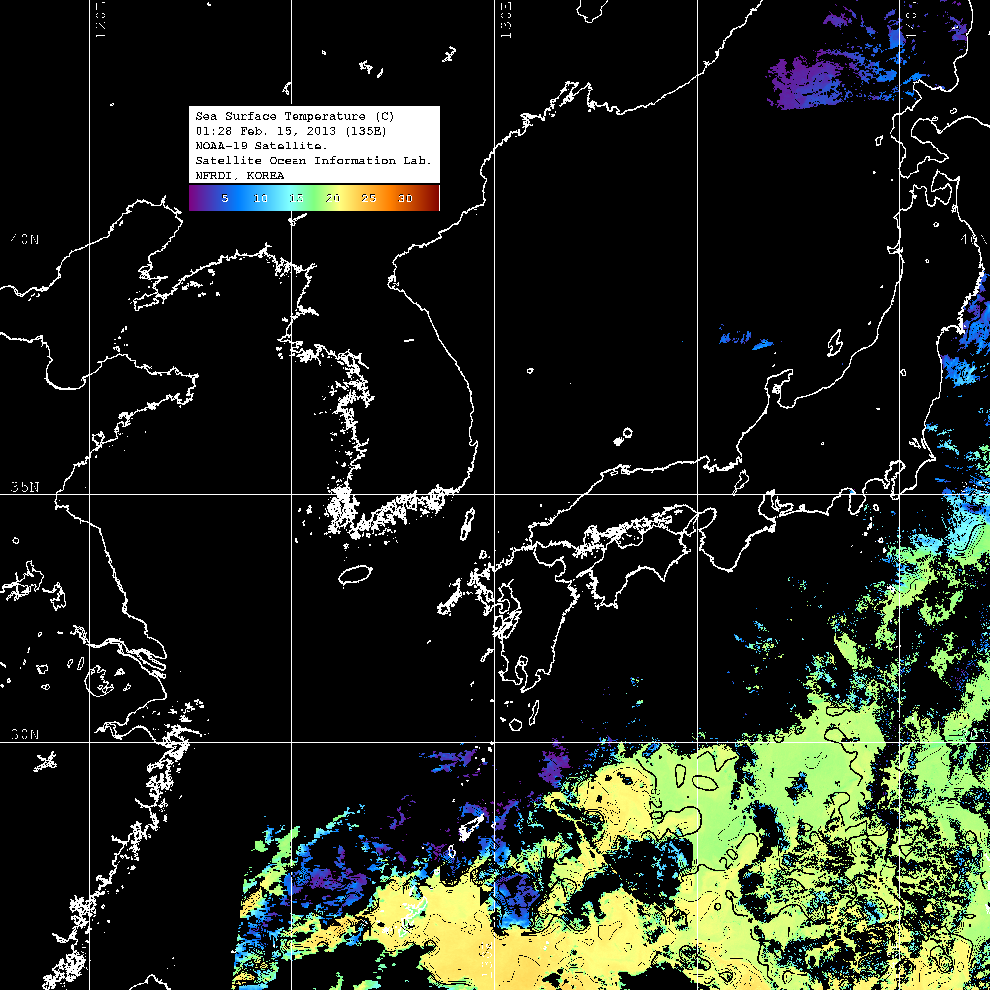 o 2013년 02월 15일 NOAA 위성영상입니다. o 영상 시간 및 수온분포는 범례를 참고하시기 바랍니다. o 검은색은 구름을 나타냅니다. o 그림을 클릭하시면 크게 보실 수 있습니다.