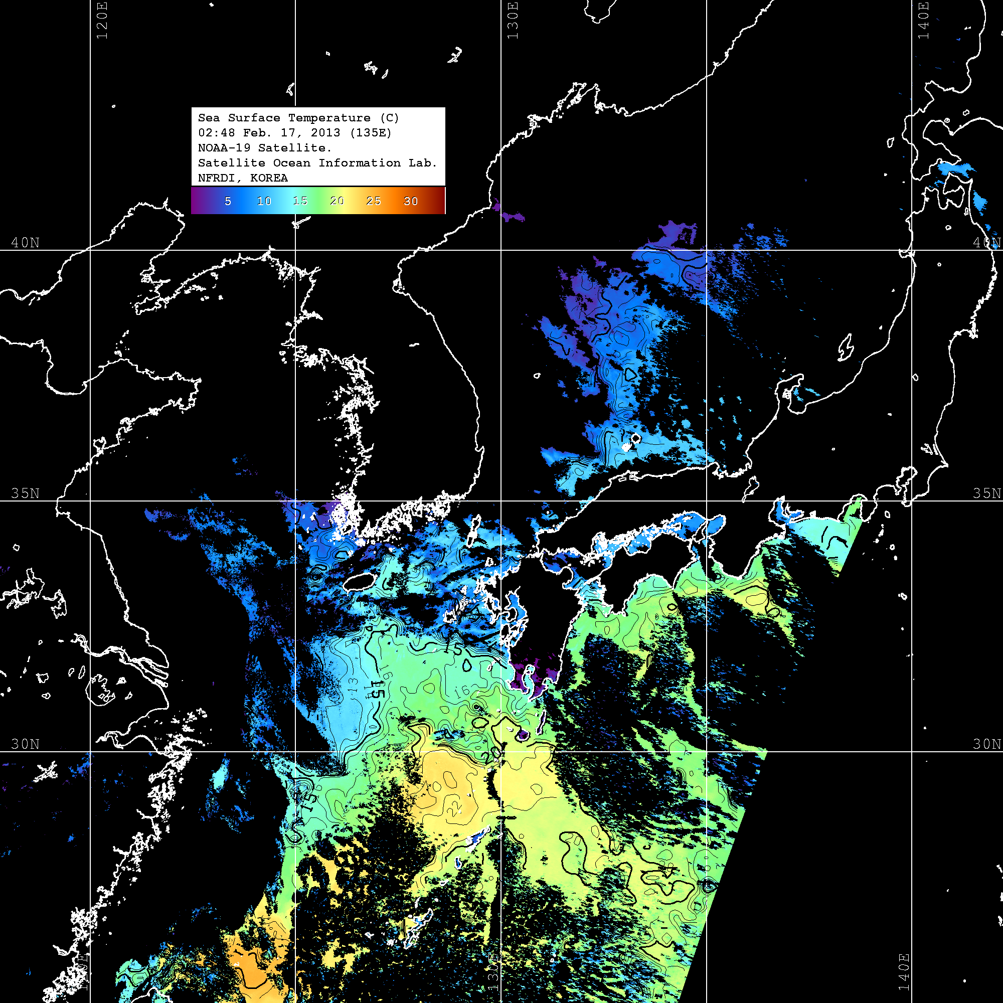 o 2013년 02월 17일 NOAA 위성영상입니다. o 영상 시간 및 수온분포는 범례를 참고하시기 바랍니다. o 검은색은 구름을 나타냅니다. o 그림을 클릭하시면 크게 보실 수 있습니다.