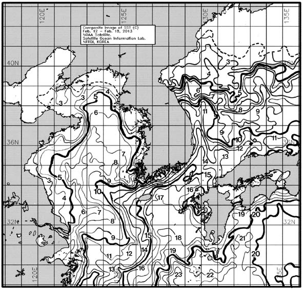 o 금주(2013.02.12~2013.02.18)의 한국근해 표면수온은 대화퇴 근해 5~6도, 울릉도-독도 근해 9~10도, 대마도 근해 15~16도, 제주도 근해 14~15도, 이어도 근해 8~9도, 가거초 근해 9~10도, 어청도 근해 5~6도, 백령도 근해 3∼4도로 나타납니다. o「평년에 비해」대화퇴 근해 1.3도 낮게, 울릉도-독도 근해 비슷하게, 대마도 근해 0.8도 높게, 제주도 근해 0.5도 높게, 이어도 근해 1도 낮게, 가거초 근해 2.1도 높게, 어청도 근해는 비슷하게 나타납니다. o「전년에 비해」대화퇴 근해 2도 낮게, 울릉도-독도 근해 비슷하게, 대마도 근해 비슷하게, 제주도 근해 0.5도 높게, 이어도 근해 1도 낮게, 가거초 근해 1.5도 높게, 어청도 근해는 1도 높게, 백령도 근해 1도 높게 나타납니다. o 수온 전선대는 우리나라 제주해협에서 대한해협까지 14도를 중심으로 형성됩니다. (http://www.nfrdi.re.kr/bbs?id=newfish) 에서도 이용하실 수 있습니다.