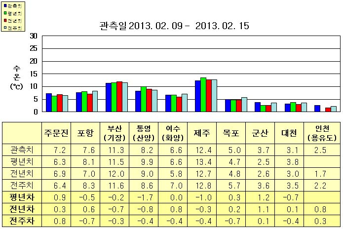 o 금주(2013.02.09~2013.02.15)의 한반도 연안 표면수온은 동해 연안역에서 섭씨 7.0~11.5도, 남해 연안역 6.5~12.5도, 서해 연안역에서 2.5~5.0도로 나타납니다. o 평년에 비해 동해 연안역은 주문진 0.9도 높게, 포항 0.5도 낮게, 부산(기장) 비슷하게 나타나며, 여수(화양) 비슷함을 제외한 남해 연안역은 1∼2도 낮게, 대천 0.7도 낮음을 제외한 서해 연안역은 0.5∼1.5도 높게 나타납니다. o 전년에 비해 동해 연안역은 주문진 비슷하게, 포항 0.6도 높게, 부산(기장) 0.6도 낮게 나타나며, 남해 연안역은 통영(산양) 0.8도 낮게, 여수(화양) 0.8도 높게, 제주 비슷하게 나타나며, 목포·대천 비슷함을 제외한 서해 연안역은 0.5∼1.5도 높게 나타납니다.