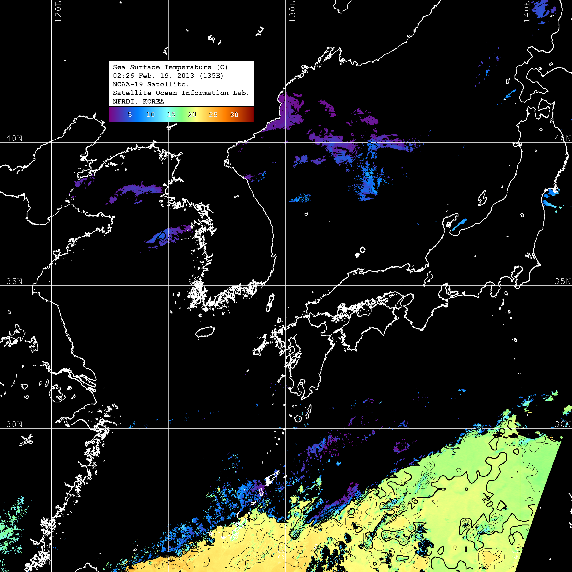 o 2013년 02월 19일 NOAA 위성영상입니다. o 영상 시간 및 수온분포는 범례를 참고하시기 바랍니다. o 검은색은 구름을 나타냅니다. o 그림을 클릭하시면 크게 보실 수 있습니다.