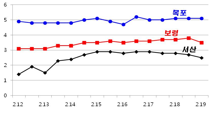 o 국립수산과학원의 실시간 관측을 통한 2월 12∼19일, 서해 3개소 (서산 가로림만, 보령 천수만 입구, 목포 죽교)와 남해 5개소 (완도 노화, 여수 신월, 남해 강진, 통영 사량, 거제 가배)의 자료 분석 결과, 수온 변동 경향은 아래와 같음. o 수온은 서해 연안에서 1∼6℃, 남해 연안 5∼10℃의 분포 범위를 보임. 수온은 각 관측소 별로 큰 변동 없이 안정적으로 나타남. o 인공위성 평균 근해 수온 분포 및 주간의 수온 편차 (B-A)는 아래와 같음. (2월 5∼11일(A), 2월 12∼18일(B)) o 전주에 비해 표면수온은 대부분의 연근해역에서 1℃ 내외 높은 분포를 보임. (A : 2월 첫째 주, B : 2월 둘째 주) o 지난 주 (2월 12∼18일) 한파에 의한 양식생물의 피해는 아래와 같음. o 지난주는 큰 한파 없이 예년 수준의 기온을 보임에 따라 수온도 큰 변화를 나타내지 않았음. 금주에도 수요일 (2월 20일) 일시적인 한파를 제외하고는 평년과 비슷한 수온을 보일 것으로 예보됨. 그러나 장기간 지속된 한파의 영향으로 양식생물의 면역력 및 생리활성이 약해져 있으므로 지속적인 주의가 요구됨. o 금주의 해수의 유출입은 소조 (2월 18일)에서 대조 (2월 26일)로 가는 시기로서 점점 활발해 질것으로 예상됨. |