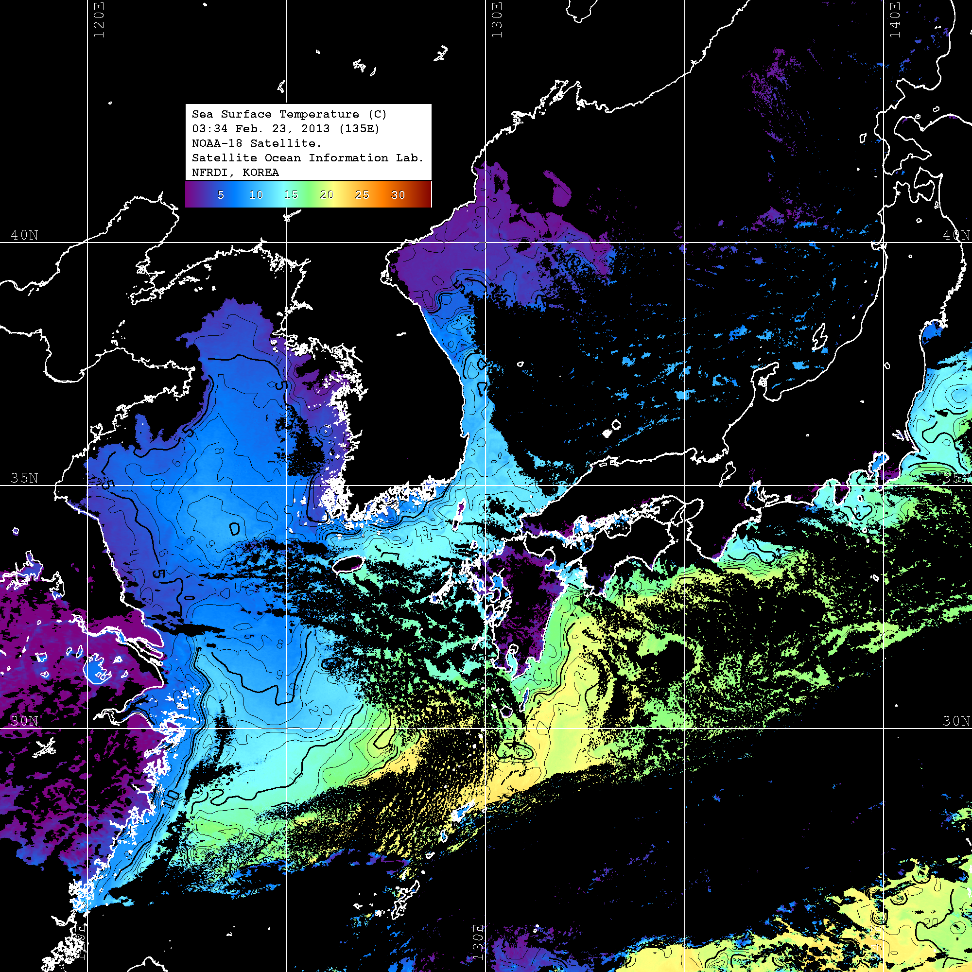 o 2013년 02월 23일 NOAA 위성영상입니다. o 영상 시간 및 수온분포는 범례를 참고하시기 바랍니다. o 검은색은 구름을 나타냅니다. o 그림을 클릭하시면 크게 보실 수 있습니다.