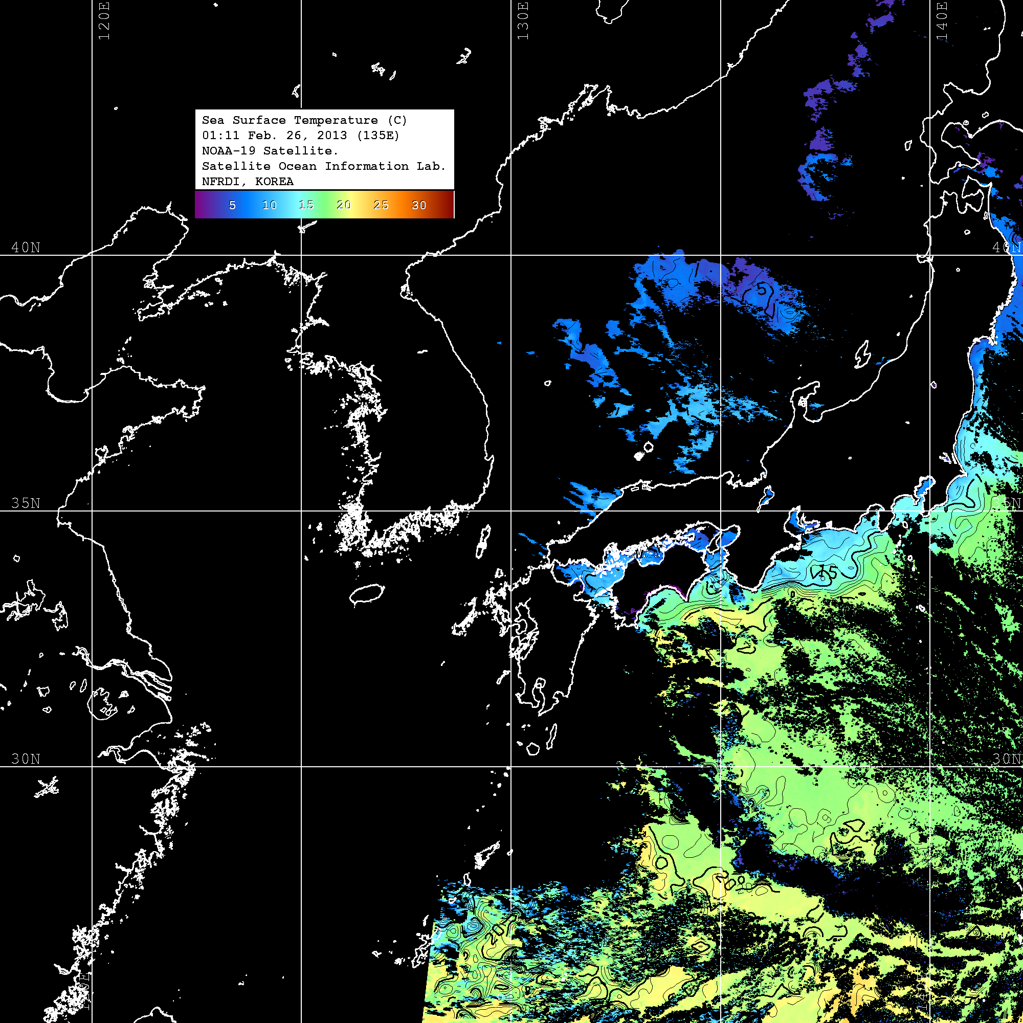 o 2013년 02월 26일 NOAA 위성영상입니다. o 영상 시간 및 수온분포는 범례를 참고하시기 바랍니다. o 검은색은 구름을 나타냅니다. o 그림을 클릭하시면 크게 보실 수 있습니다.