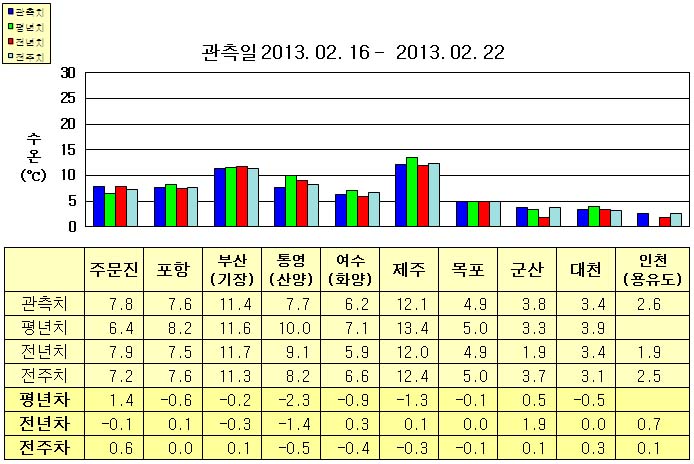 o 금주(2013.02.16~2013.02.22)의 한반도 연안 표면수온은 동해 연안역에서 섭씨 7.5~11.5도, 남해 연안역 6.0~12.5도, 서해 연안역에서 2.5~5.0도로 나타납니다. o 평년에 비해 동해 연안역은 주문진 1.4도 높게, 포항 0.6도 낮게, 부산(기장) 비슷하게 나타나며, 남해 연안역은 0.5∼2.5도 낮게, 서해 연안역은 목포 비슷하게, 군산 0.5도 높게, 대천 0.5도 낮게 나타납니다. o 전년에 비해 동해 연안역은 비슷하게, 통영(산양) 1.4도 낮음을 제외한 남해 연안역은 비슷하게, 목포?대천 비슷함을 제외한 서해 연안역은 0.5∼2.0도 높게 나타납니다.