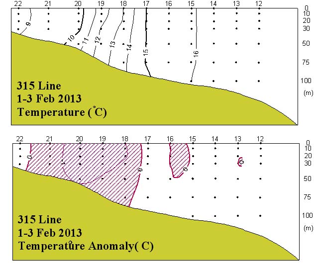 ㅇ 2013년 2월 26일 국립수산과학원 남서해수산연구소에서 조사한 동중국해 북부해역(315선)의 수온 수직분포도와 평년편차도입니다. ㅇ 수온이 연직적으로 균일하게 분포하고 있고, 대상 해역의 동쪽으로 갈수록 수온이 높아지는 분포를 보이고 있다. ㅇ 평년에 비하여 정점 16 부근 일부와 정점 17~22사이 수층에서 1℃내외의 저온현상을 나타냈습니다.