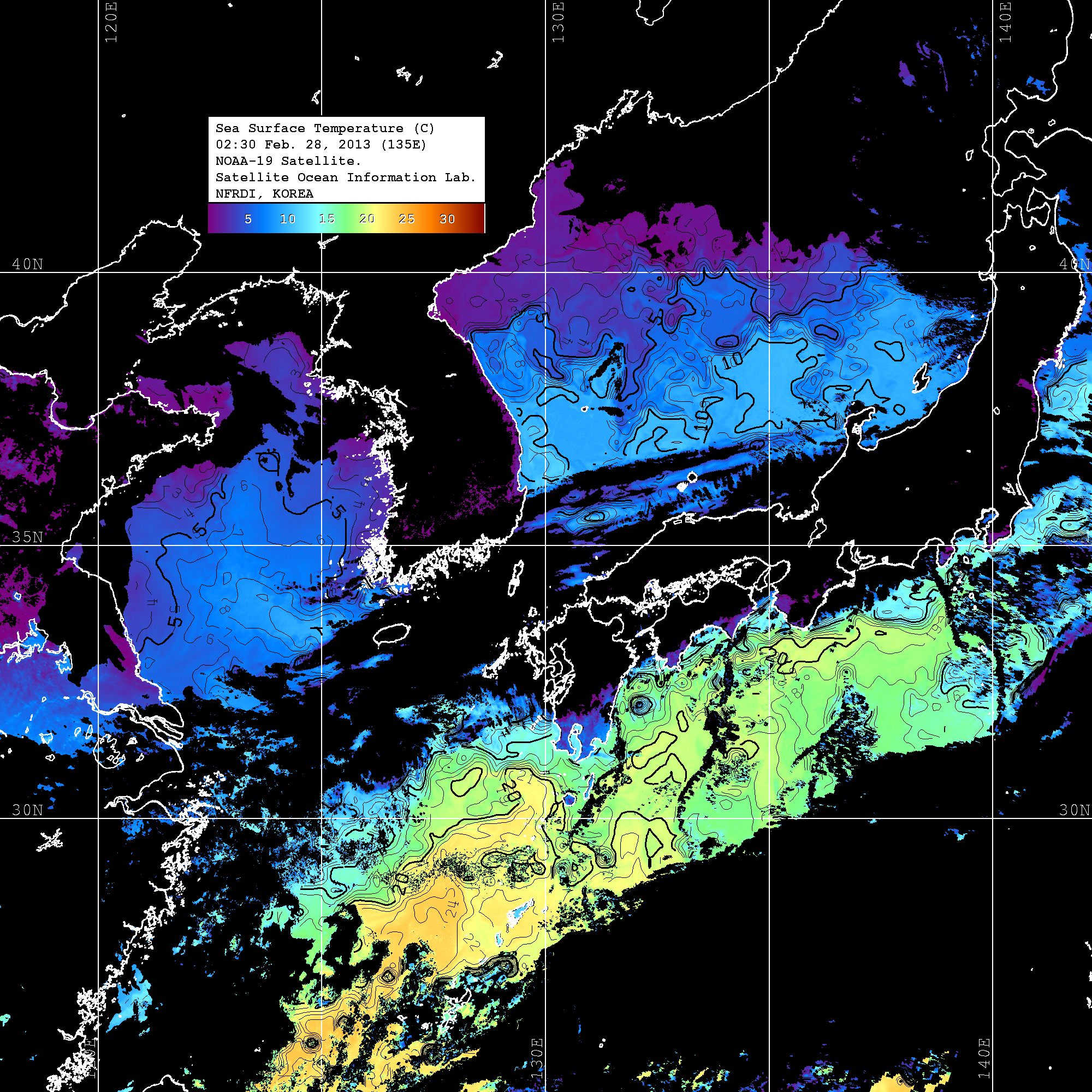o 2013년 02월 28일 NOAA 위성영상입니다. o 영상 시간 및 수온분포는 범례를 참고하시기 바랍니다. o 검은색은 구름을 나타냅니다. o 그림을 클릭하시면 크게 보실 수 있습니다.