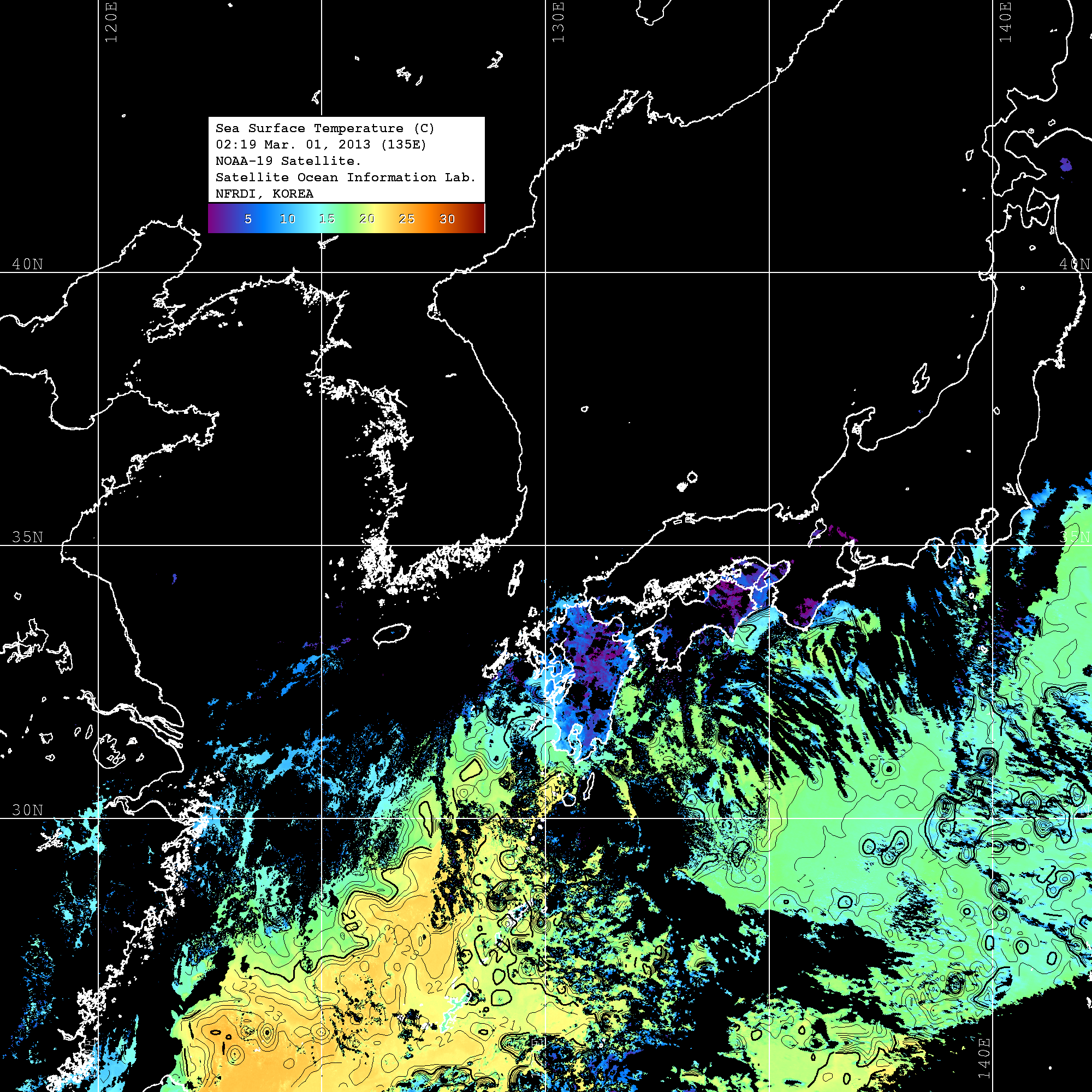o 2013년 03월 01일 NOAA 위성영상입니다. o 영상 시간 및 수온분포는 범례를 참고하시기 바랍니다. o 검은색은 구름을 나타냅니다. o 그림을 클릭하시면 크게 보실 수 있습니다.
