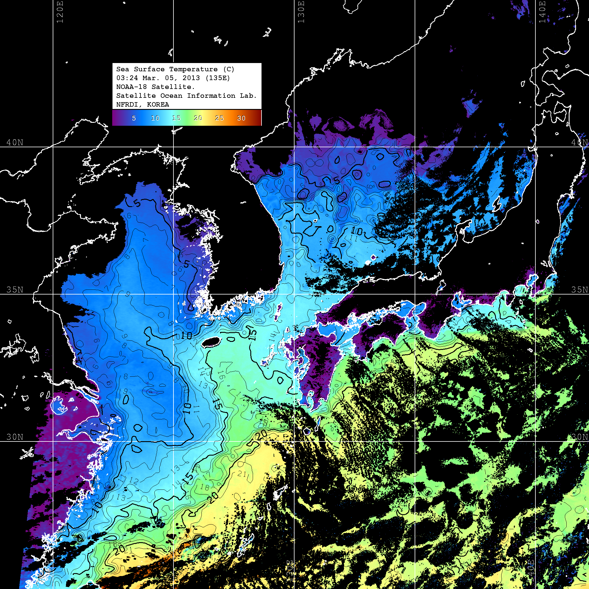 o 2013년 03월 05일 NOAA 위성영상입니다. o 영상 시간 및 수온분포는 범례를 참고하시기 바랍니다. o 검은색은 구름을 나타냅니다. o 그림을 클릭하시면 크게 보실 수 있습니다.