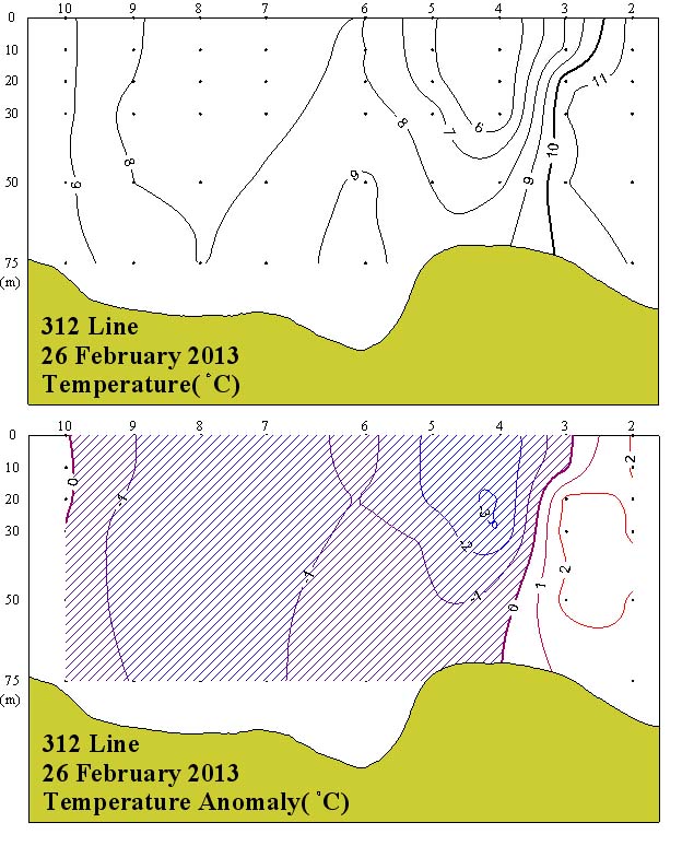 ㅇ 2013년 2월 26일 국립수산과학원 서해수산연구소에서 조사한 312선 (제주해협 서방)의 수직수온분포도 및 평년편차도입니다. ㅇ 정점 2~4사이에 서해의 찬 해수와 상대적으로 따뜻한 제주난류수가 만나 수온전선이 존재하였습니다. ㅇ 평년에 비하여 정점 2~3사이를 제외한 대부분 해역에서 1~3℃ 범위의 저온현상을 보였습니다.