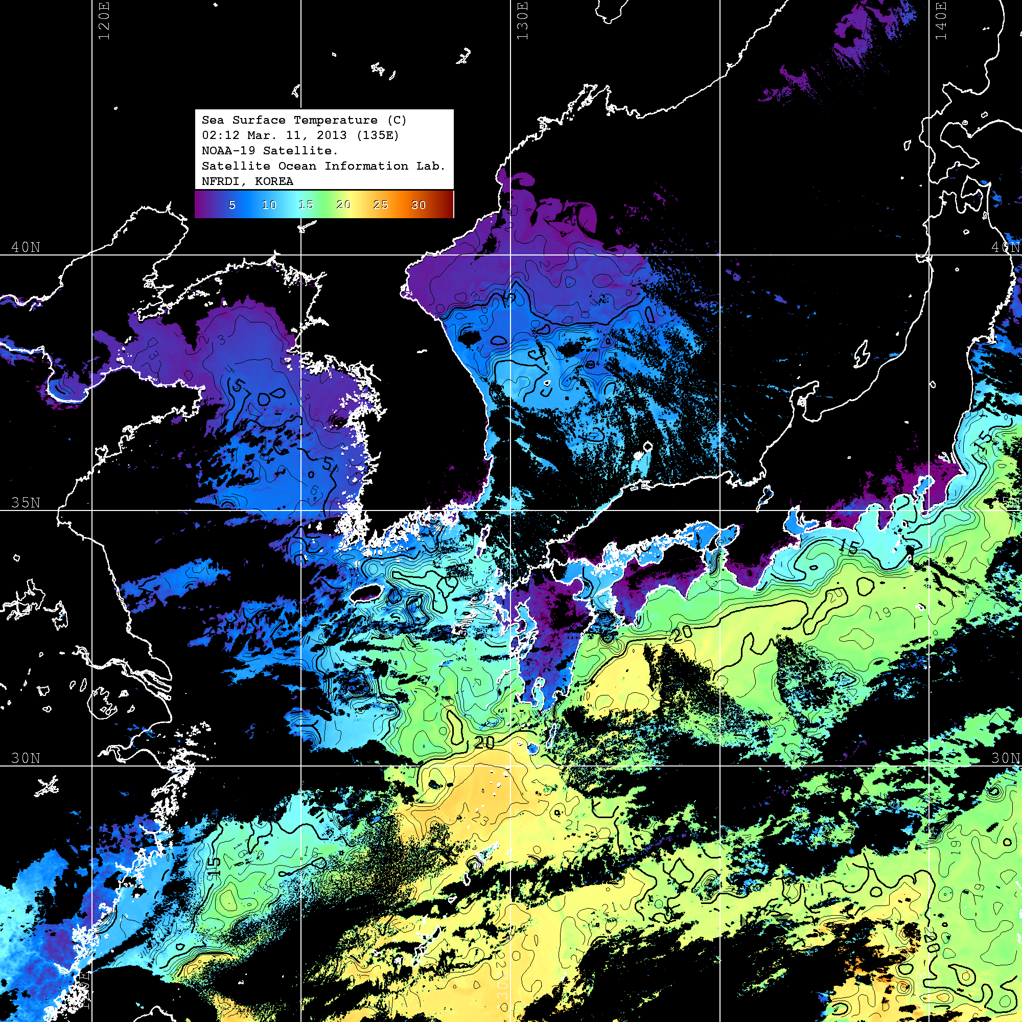 o 2013년 03월 11일 NOAA 위성영상입니다. o 영상 시간 및 수온분포는 범례를 참고하시기 바랍니다. o 검은색은 구름을 나타냅니다. o 그림을 클릭하시면 크게 보실 수 있습니다.