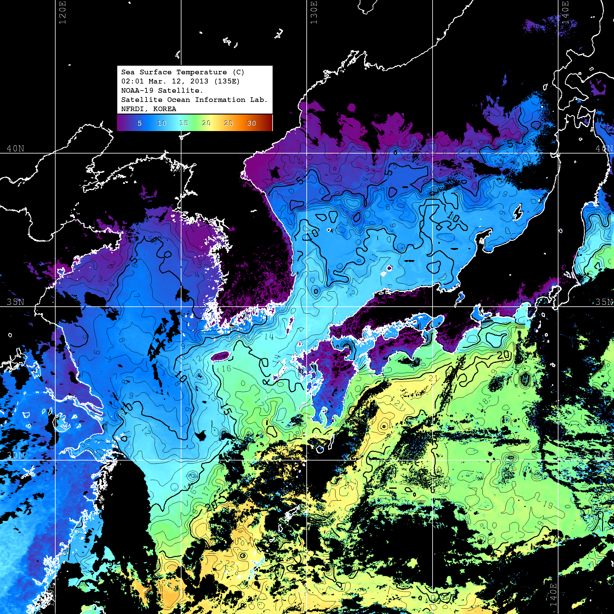 o 2013년 03월 12일 NOAA 위성영상입니다. o 영상 시간 및 수온분포는 범례를 참고하시기 바랍니다. o 검은색은 구름을 나타냅니다. o 그림을 클릭하시면 크게 보실 수 있습니다.
