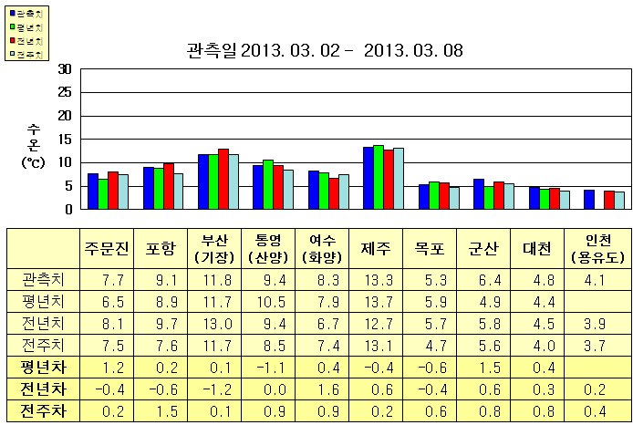 o 금주(2013. 03. 02~2013. 03. 08)의 한반도 연안 표면수온은 동해 연안역에서 섭씨 7.5~12.0도, 남해 연안역 8.0~13.5도, 서해 연안역에서 4.0~6.5도로 나타납니다. o 평년에 비해 주문진 1.2도 높음을 제외한 동해연안역은 비슷하게 나타나며, 여수(화양) 0.4도 높음을 제외한 남해 연안역은 0.5~1.5도 낮게, 목포 0.6도 낮음을 제외한 서해 연안역은 0.5~1.5도 높게 나타납니다. o 전년에 비해 동해 연안역은 0.5~1.5도 낮게, 통영(산양) 비슷함을 제외한 남해 연안역은 0.5~2.0도 높게, 목포 0.4도 낮고, 군산 0.6도 높음을 제외한 서해 연안역은 비슷하게 나타납니다.