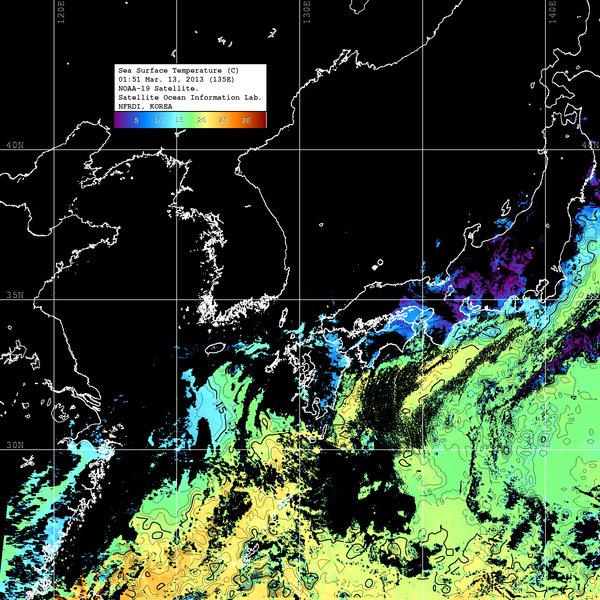 o 2013년 03월 13일 NOAA 위성영상입니다. o 영상 시간 및 수온분포는 범례를 참고하시기 바랍니다. o 검은색은 구름을 나타냅니다. o 그림을 클릭하시면 크게 보실 수 있습니다.