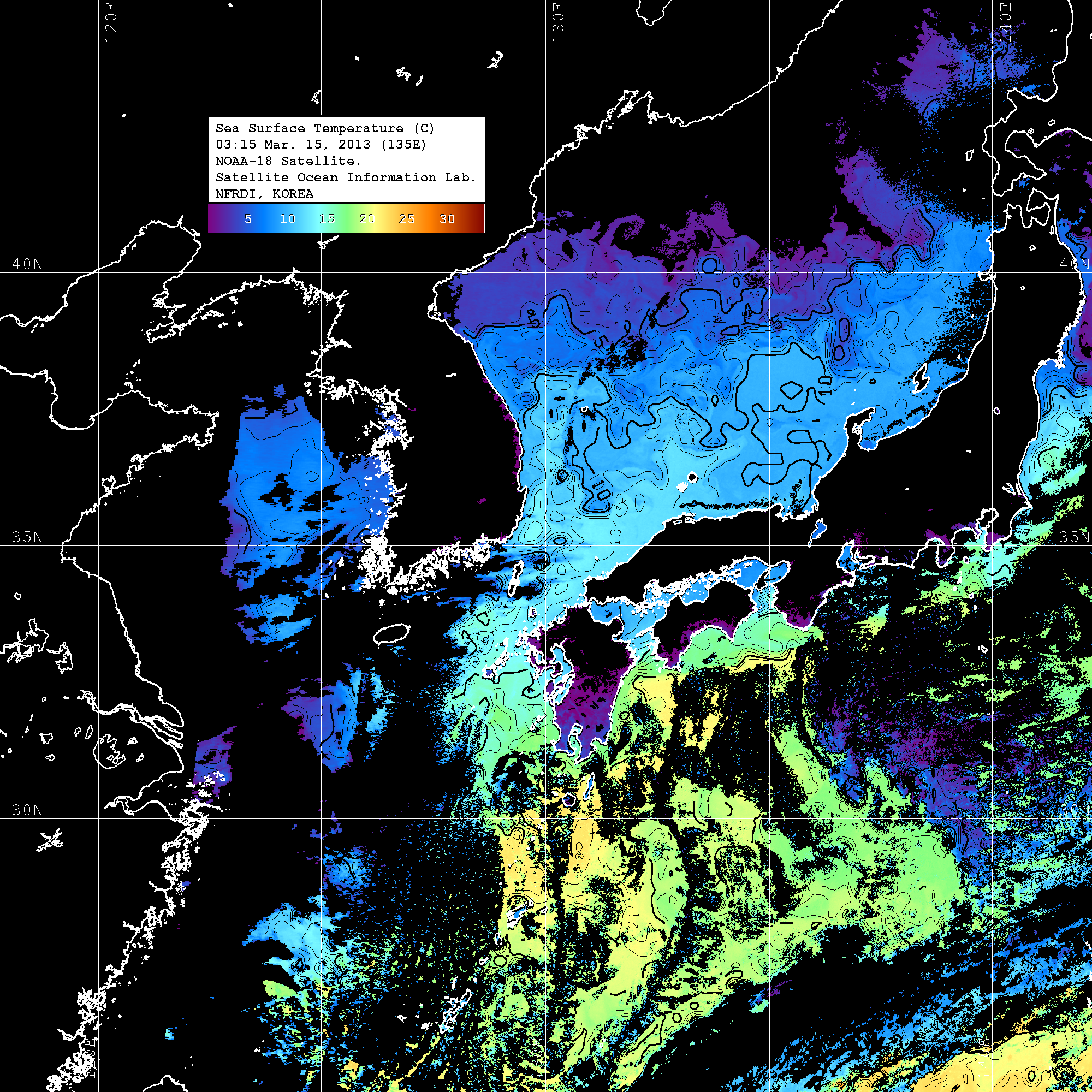 o 2013년 03월 15일 NOAA 위성영상입니다. o 영상 시간 및 수온분포는 범례를 참고하시기 바랍니다. o 검은색은 구름을 나타냅니다. o 그림을 클릭하시면 크게 보실 수 있습니다.