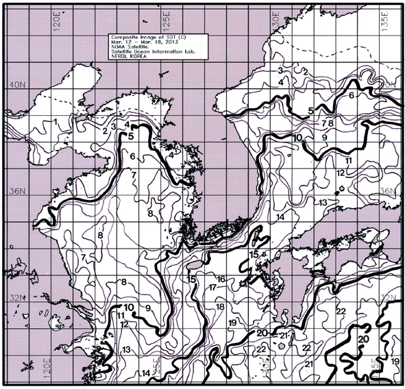 o 금주(2013. 03. 12~2013. 03. 18)의 한국근해 표면수온은 대화퇴 근해 5~6도, 울릉도-독도 근해 10~11도, 대마도 근해 15~16도, 제주도 근해 13~15도, 이어도 근해 7~9도, 가거초 근해 7~9도, 어청도 근해 6~7도, 백령도 근해 4∼5도로 나타납니다. o「평년에 비해」대화퇴 근해 1.6도 낮게, 울릉도-독도 근해 0.6도 높게, 대마도 근해 0.8도 높게, 제주도 근해 비슷하게, 이어도 근해 1.2도 낮게, 가거초 근해 0.8도 낮게, 어청도 근해 1.3도 높게 나타납니다. o「전년에 비해」대화퇴 근해 비슷하게, 울릉도-독도 근해 0.5도 높게, 대마도 근해 1도 높게, 제주도 근해 비슷하게, 이어도 근해 0.5도 낮게, 가거초 근해 1.5도 높게, 어청도 근해는 3도 높게, 백령도 근해 1.5도 높게 나타납니다. o 수온 전선대는 우리나라 제주해협에서 대한해협까지 14도를 중심으로 형성됩니다. (http://www.nfrdi.re.kr/bbs?id=newfish) 에서도 이용하실 수 있습니다.