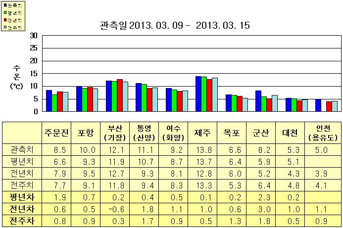 o 금주(2013. 03. 09~2013. 03. 15)의 한반도 연안 표면수온은 동해 연안역에서 섭씨 8.5~12.5도, 남해 연안역 9~14도, 서해 연안역에서 5.0~8.5도로 나타납니다. o 평년에 비해 부산(기장) 비슷함을 제외한 동해연안역은 0.5~2.0도 높게 나타나며, 제주 비슷함을 제외한 남해 연안역은 0.5도 높게, 군산 2.3도 높음을 제외한 서해 연안역은 비슷하게 나타납니다. o 전년에 비해 부산 0.6도 낮음을 제외한 동해 연안역은 0.5~1.0도 높게, 남해 연안역은 1~2도 높게, 서해 연안역은 0.5~3.0도 높게 나타납니다.
