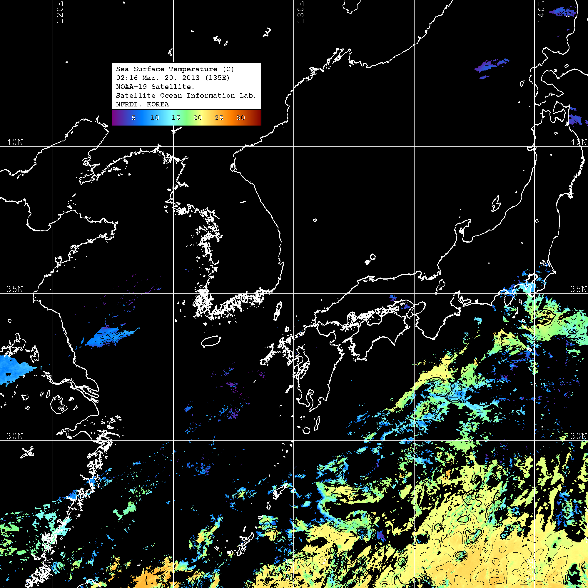 o 2013년 03월 20일 NOAA 위성영상입니다. o 영상 시간 및 수온분포는 범례를 참고하시기 바랍니다. o 검은색은 구름을 나타냅니다. o 그림을 클릭하시면 크게 보실 수 있습니다.