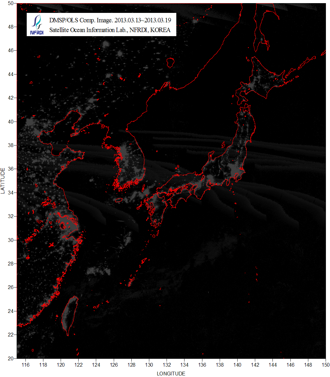 o 2013년 03월 20일자 합성 DMSP/OLS 위성영상입니다. o 영상 시간은 범례를 참고하시 바랍니다. o 그림을 클릭하시면 크게 보실 수 있습니다. |