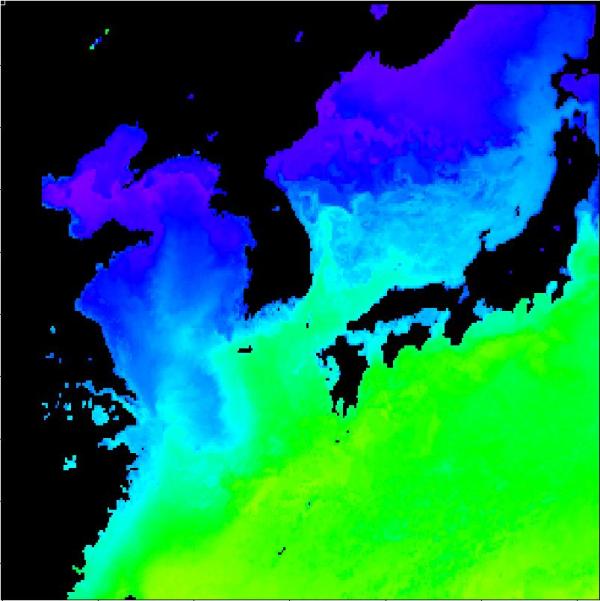국립수산과학원 위성해양정보실에서 연구중인 2013년 03월 21일 구름이 배제된 수온 영상입니다