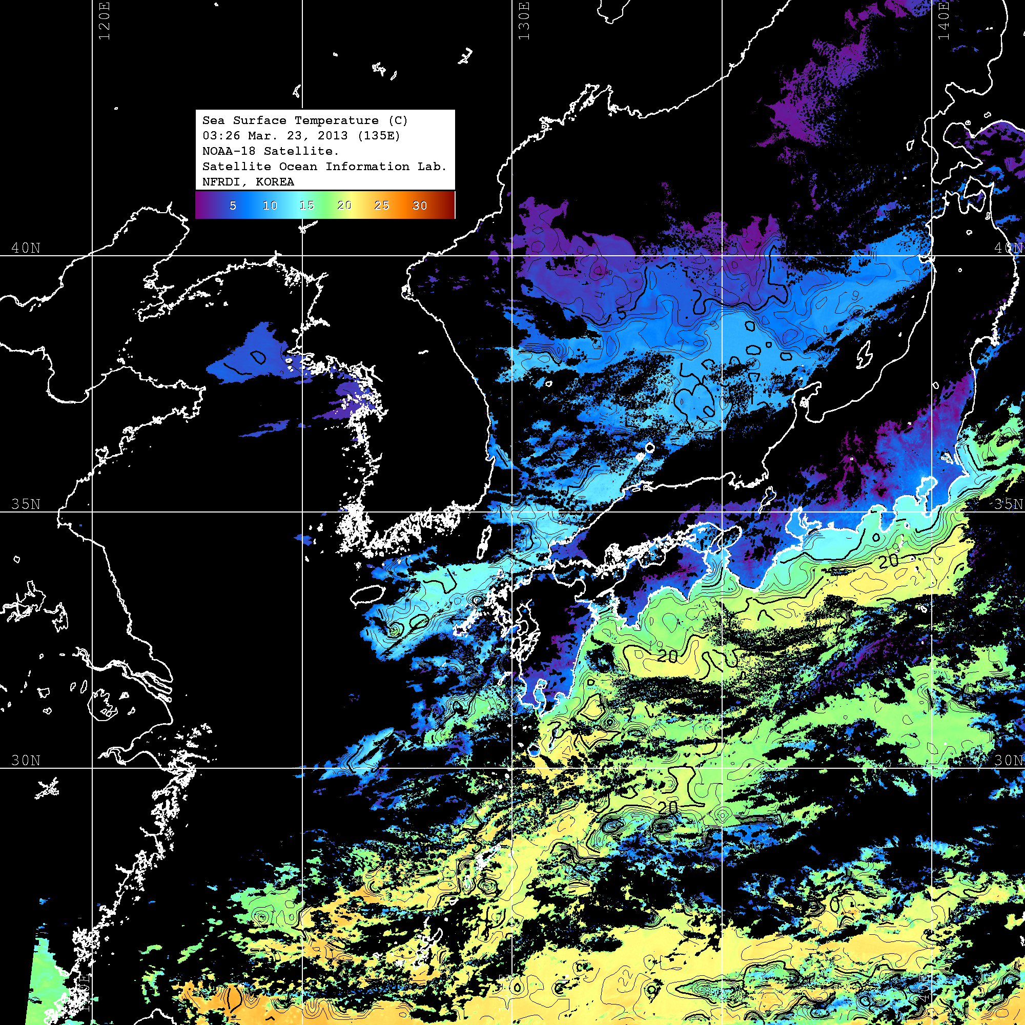 o 2013년 03월 23일 NOAA 위성영상입니다. o 영상 시간 및 수온분포는 범례를 참고하시기 바랍니다. o 검은색은 구름을 나타냅니다. o 그림을 클릭하시면 크게 보실 수 있습니다.