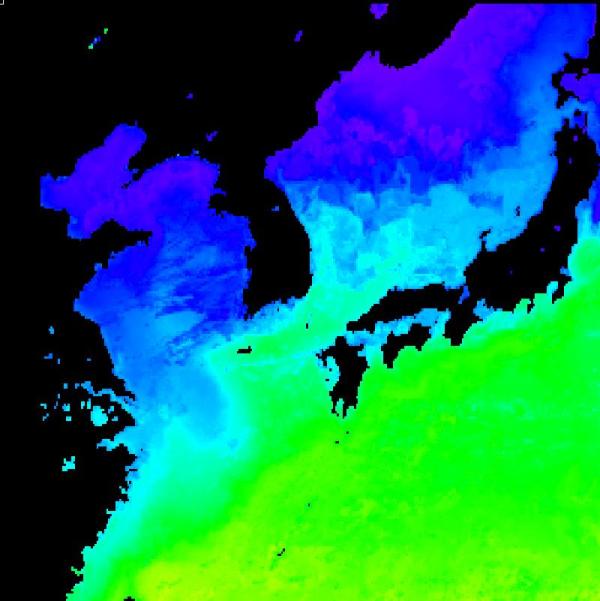 국립수산과학원 위성해양정보실에서 연구중인 2013년 03월 23일 구름이 배제된 수온 영상입니다.