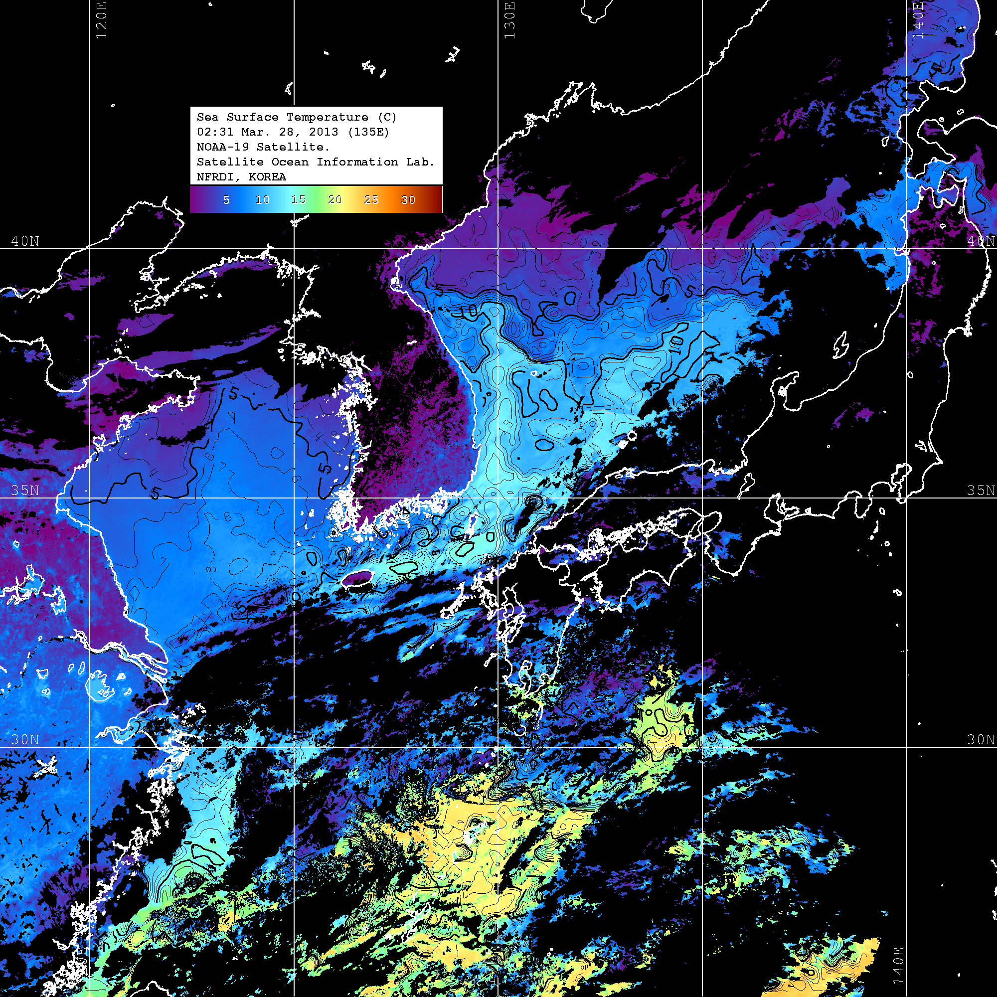 o 2013년 03월 28일 NOAA 위성영상입니다. o 영상 시간 및 수온분포는 범례를 참고하시기 바랍니다. o 검은색은 구름을 나타냅니다. o 그림을 클릭하시면 크게 보실 수 있습니다.