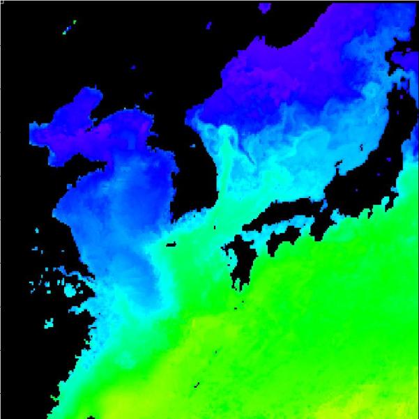 국립수산과학원 위성해양정보실에서 운영중인 2013년 03월 31일 구름이 배제된 수온 영상입니다