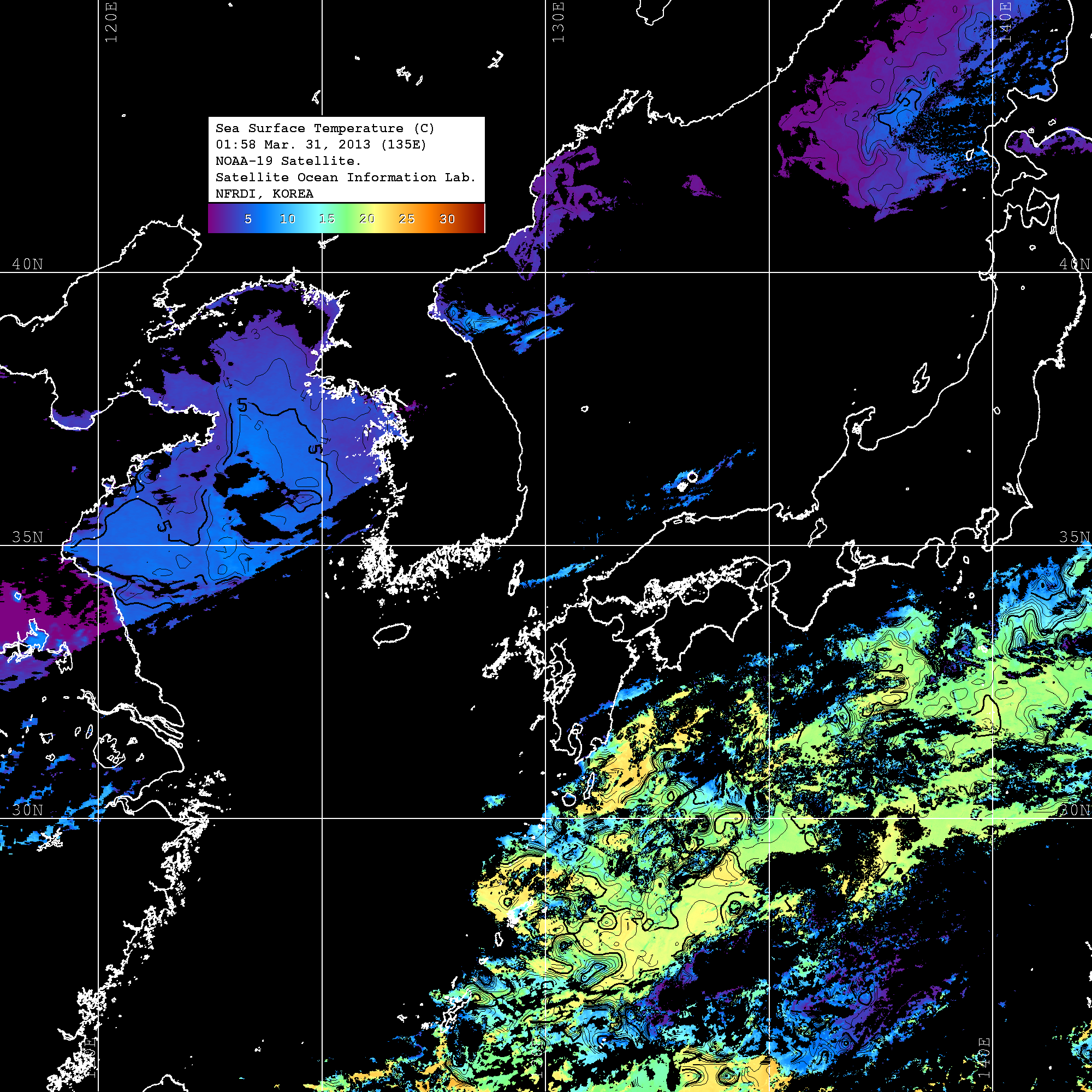 o 2013년 03월 31일 NOAA 위성영상입니다. o 영상 시간 및 수온분포는 범례를 참고하시기 바랍니다. o 검은색은 구름을 나타냅니다. o 그림을 클릭하시면 크게 보실 수 있습니다.