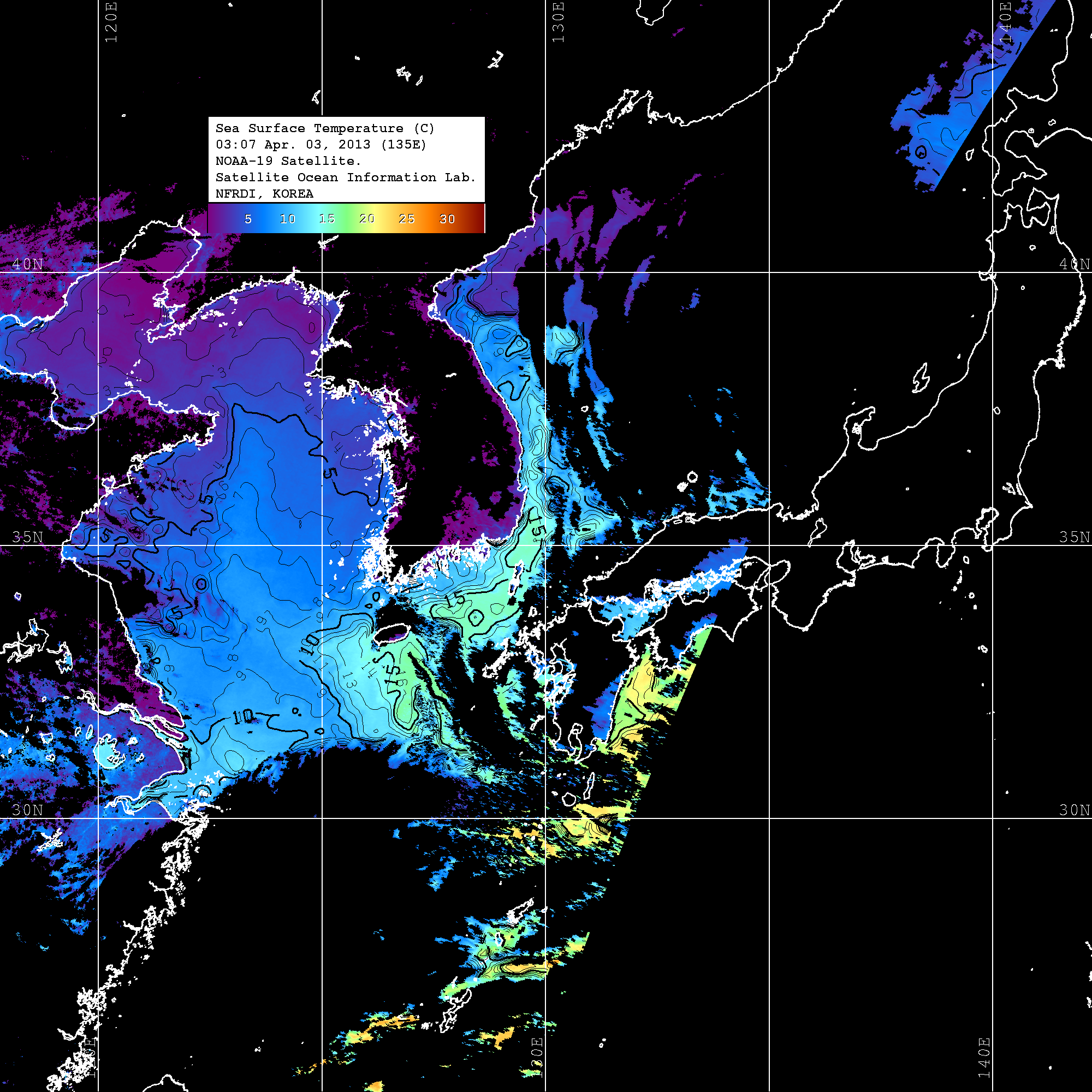 o 2013년 04월 03일 NOAA 위성영상입니다. o 영상 시간 및 수온분포는 범례를 참고하시기 바랍니다. o 검은색은 구름을 나타냅니다. o 그림을 클릭하시면 크게 보실 수 있습니다.