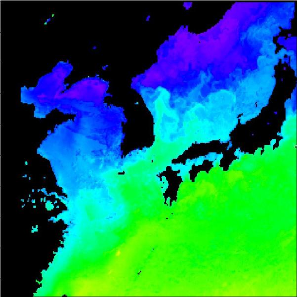 국립수산과학원 위성해양정보실에서 운영중인 2013년 04월 03일 구름이 배제된 수온 영상입니다