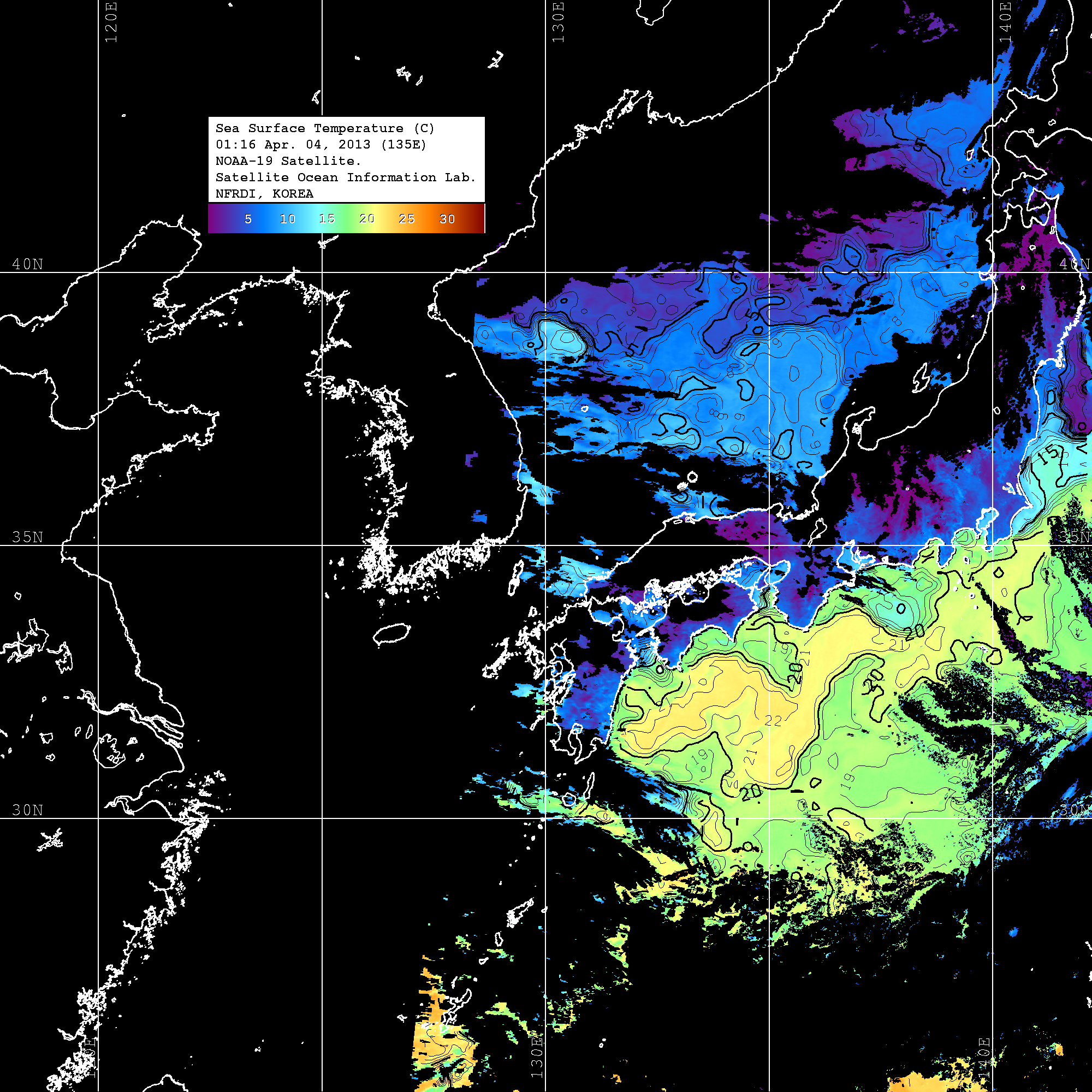 o 2013년 04월 04일 NOAA 위성영상입니다. o 영상 시간 및 수온분포는 범례를 참고하시기 바랍니다. o 검은색은 구름을 나타냅니다. o 그림을 클릭하시면 크게 보실 수 있습니다.