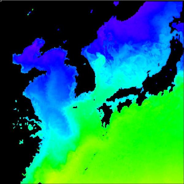 국립수산과학원 위성해양정보실에서 연구중인 2013년 04월 07일 구름이 배제된 수온 영상입니다