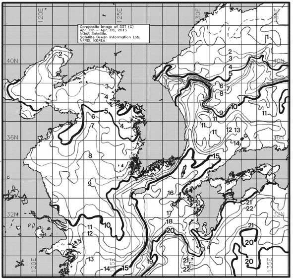 ◦ 금주(2013. 04. 02~2013. 04. 08)의 한국근해 표면수온은 대화퇴 근해 6~7도, 울릉도-독도 근해 11~12도, 대마도 근해 15~16도, 제주도 근해 14~15도, 이어도 근해 9~10도, 가거초 근해 8~9도, 어청도 근해 5~6도, 백령도 근해 3∼4도로 나타납니다. ◦「평년에 비해」대화퇴 근해 0.8도 낮게, 울릉도-독도 근해 1.7도 높게, 대마도 근해 1도 높게, 제주도 근해 0.7도 높게, 이어도 근해 0.5도 낮게, 가거초 근해 0.7도 낮게, 어청도 근해 1.2도 낮게 나타납니다. ◦「전년에 비해」대화퇴 근해 3.5도 높게, 울릉도-독도 근해 1도 높게, 대마도 근해 0.5도 높게, 제주도 근해 0.5도 높게, 이어도 근해 비슷하게, 가거초 근해 1.5도 높게, 어청도 근해는 0.5도 높게, 백령도 근해 0.5도 낮게 나타납니다. ◦ 수온 전선대는 우리나라 제주해협에서 대한해협까지 14도를 중심으로 형성됩니다. |