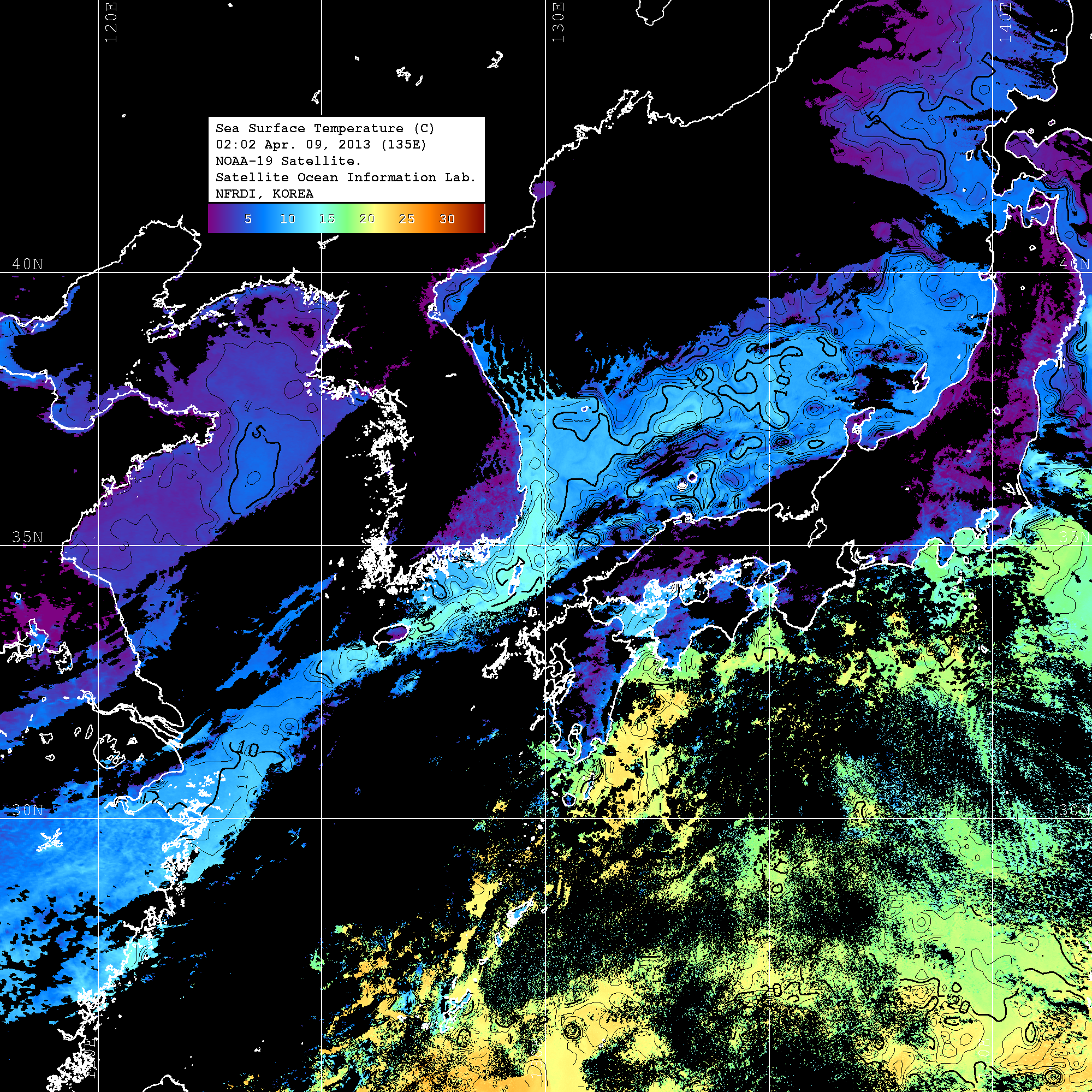 o 2013년 04월 09일 NOAA 위성영상입니다. o 영상 시간 및 수온분포는 범례를 참고하시기 바랍니다. o 검은색은 구름을 나타냅니다. o 그림을 클릭하시면 크게 보실 수 있습니다.