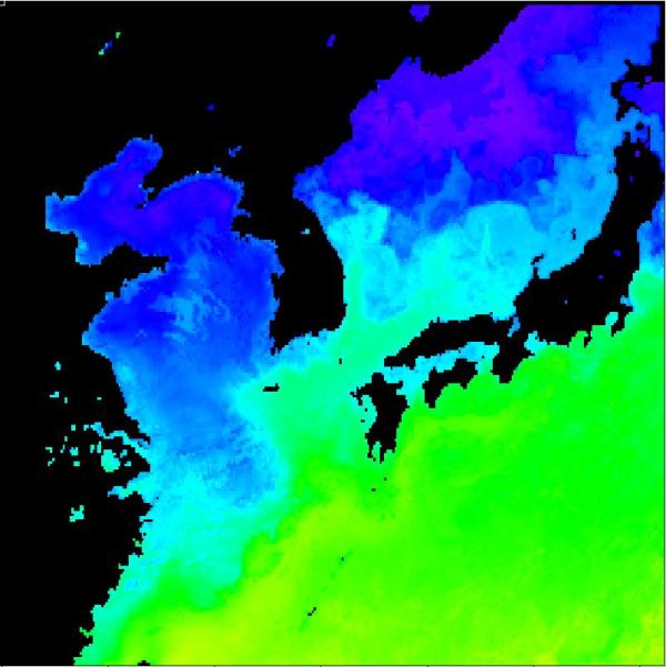 국립수산과학원 위성해양정보실에서 연구중인 2013년 04월 10일 구름이 배제된 수온 영상입니다