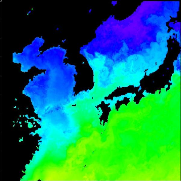 국립수산과학원 위성해양정보실에서 연구중인 2013년 04월 11일 구름이 배제된 수온 영상입니다