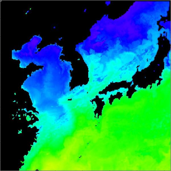 국립수산과학원 위성해양정보실에서 연구중인 2013년 04월 14일 구름이 배제된 수온 영상입니다